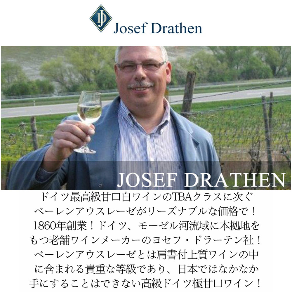 【商品説明】ドイツ・ラインヘッセン産、極甘口白ワイン愛好家大注目!デザートワイン愛好家大注目! ドイツ最高級甘口ワインのTBAクラスに次ぐベーレンアウスレーゼがリーズナブルな価格で限定少量入荷! ちなみにベーレンアウスレーゼとは肩書付上質ワインの中に含まれる貴重な等級であり、日本ではなかなか手にすることはできない高級ドイツワイン! しかも十分に熟したブドウの房を選りすぐって醸造する肩書付上質ワインにアウスレーゼという等級があり、甘口ワインが多いのですが、このアウスレーゼ用のブドウからさらに完熟度の高い果粒のみを選んで仕込むのがこのベーレンアウスレーゼ (粒選りという意味) です! 味わいの特徴としては、濃厚で芳醇、コクのある甘味があり、貴腐ワインのような味わいを楽しむことができます! ベーレンアウスレーゼも高級ワインであり、やはりその甘味から食事に合わせるというよりは食後のデザートワインとして味わうことが多いワインです! しかも造り手は、1860年創業!ドイツ、モーゼル河流域に本拠地をもつ老舗ワインメーカーのヨセフ・ドラーテン社!!ラインラント=ファルツ州ザンクト・アルデグントにピーター・ジョセフ・ドラーテンワイナリーとして設立!1927年に現ジョセフ・ドラーテンに改称!創設者ジョセフ・ドラーテン亡き後は妻のエルザと姪夫婦が意思を継ぎ、以来、世代から世代へと創設者の想いは脈々と引き継がれている!創立から100年以上、時代を超えて成長を重ねる志は揺らぐことがなく、1993年には近代的な醸造設備を新設!更なる理想を実現するために貪欲にワイン造りに邁進し、国内外から厚い信頼を得る、地域屈指の造り手のひとり! このオルテガ種40%にリースリング種30%、フクセルレーベ種30%をステンレスタンクにて約3ヶ月間熟成で造られるセント・チャールズ・ベーレンアウスレーゼ・ラインヘッセンは、輝きのある淡い黄金色!アプリコット、ピーチの濃密でフルーティな香りと、蜂蜜やシロップ漬けした果実の甘美で濃縮感ある香り!口当たりは柔らかく、天然果実の凝縮した甘味に、丸みのある酸味が心地よい極甘口のデザートワイン!がリーズナブルな価格で限定少量入荷!