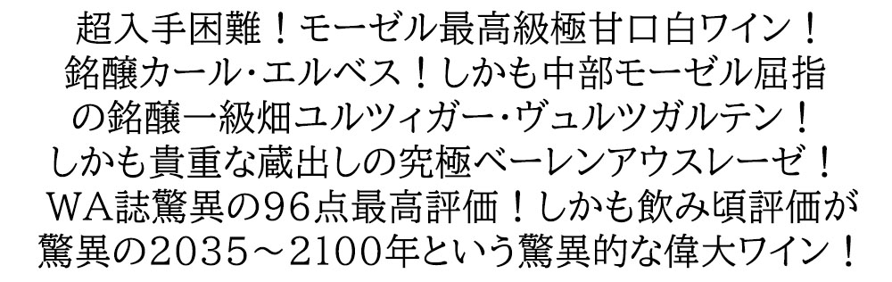![]() 【ハーフサイズ】ユルツィガー ヴュルツガルテン リースリング ベーレンアウスレーゼ 2018 カール エルベス家元詰 375ml ■ぶどう品種:リースリング種100% ■発酵・熟成:3ヶ月発酵、3ヶ月熟成 ■残糖:260.1g/L ■酸度:7.8g/L ドイツ・モーゼル最高級極甘口白ワイン愛好家垂涎!中部モーゼルでも指折りの生産者として評価を得ているカール・エルベス家(現当主ステファン・エルベス)による貴重な蔵出しベーレンアウスレーゼ! なんと!このユルツィガー・ヴュルツガルテン・リースリング・ベーレンアウスレーゼ[2018]年でワインアドヴォケイト誌驚異の96点を獲得!しかも飲み頃評価が信じられない驚異の2035~2100年という驚異的なワイン! ヨーロッパの高級レストランでもドイツワインのオンリストの店が増えています!あのエルブジで修行したシェフの店、デンマークの「ノマ」でもアウスレーゼやベーレンアウスレーゼの古酒がオンリストされています!しっかりとした甘みのあるエルベス家自慢のベーレンアウスレーゼのハーフサイズで、しかも蔵出し品で日本への入荷わずか60本のみの愛好家垂涎の逸品が超限定少量入荷! |