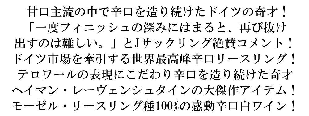 【ワインについて】モーゼル・リースリング種100%辛口白ワイン愛好家大注目!甘口主流の中で辛口を造り続けた奇才!ドイツワイン市場を牽引する世界最高峰の辛口リースリング!各ワイン評論家の最高絶賛コメントは以下をご覧ください。『このワインを飲んでしまうと正直なところ、いくつかのグラン・クリュさえ退屈に思えてしまう』by.ゴーミヨ誌!「快楽主義者はもちろんのこと知識人でも楽しめるワインだ。偉大な、時代にふさわしいリースリングである。」(Wine Advocate)!「充分に成熟したブルゴーニュの白ワインに似たストラクチャーがある。」(Jancis Robinson)ジャンシス・ロビンソン女史!「一度フィニッシュの深みにはまると、再び抜け出すのは難しい。」((ジェームス・サックリング・James Suckling)「モーゼル最高の辛口ワイン」(ゴーミヨ誌)モーゼルのモンラッシェ(Wein-Plus)!甘口リースリングが流行した時代にも、テロワールの表現にこだわり辛口を造り続けた「奇才」=ヘイマン・レーヴェンシュタインによるシーファーテラッセン=「シーファー=スレート土壌」「テラッセン=段々畑」!まさにスタンダード・キュヴェとは思えない程上質な味わい!若くても熟成しても美味しいため、飲み頃を選ばずにモーゼルの魅力が味わえる大人気辛口白ワイン!「シーファーテラッセン」は、平均樹齢は40年、様々なスレート土壌のブドウをブレンドして作られる!よく熟したリンゴのフレーバーとスレートに由来するスパイシーなアロマ!口に含むと果実の完熟感、ボリュームがありながらもデリケートなミネラルのおかげでエレガントさが両立している!ミディアム-フルボディーで、フィニッシュには爽やかな辛口フレーバーが残るしっかりしたストラクチャーのリースリング!若くても熟成しても美味しいため、飲み頃を選ばずにモーゼルの魅力が味わえる!このシーファーテラッセン[2020]年はステンレスタンクとフードルで発酵、10ヶ月熟成で造られます!このワインでワインアドヴォケイト誌90点+(今~2034年)獲得!アドヴォケイト誌のコメントは『2020年のリースリング、シーファーテラッセンは、(非常に)熟した暖かい果実のアロマに、スレートのようなニュアンスが絡み合っています。豊かで丸みがあり、クリスタルで塩味のある味わいで、モーゼル下流の急斜面のテラスで造られた、かなりリッチでパワフルなリースリングです。アルコール度数13%。スクリューキャップ。』と絶賛!ボリューム、純粋さ、エレガント、デリケートなミネラル、素晴らしい肉質を兼ね備えている!口に含んだ、成熟感、まろやかさ、エレガントさを持ち合わせたミディアムからフルボディで、フィニッシュは爽やかで、辛口のフレーヴァーが残るしっかりとしたストラクチャーのリースリング100%のドイツ傑作辛口白ワインが限定で少量入荷!