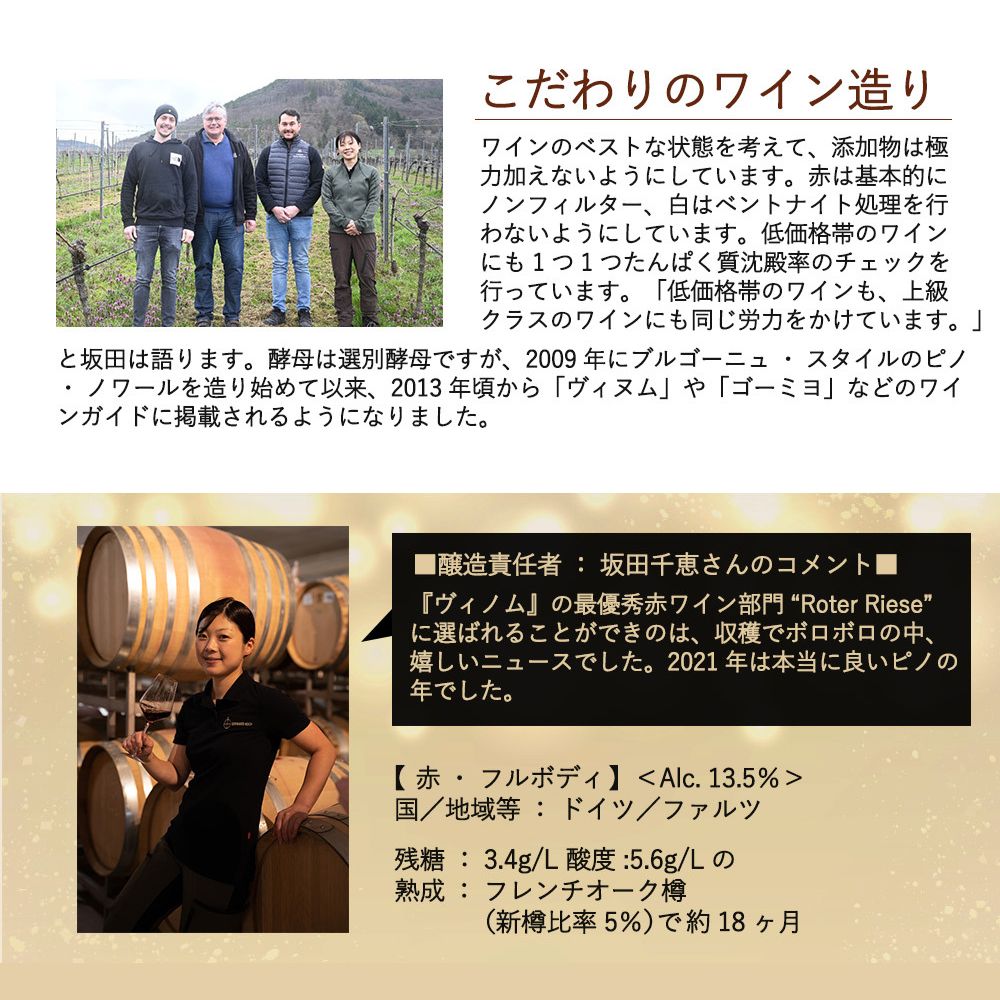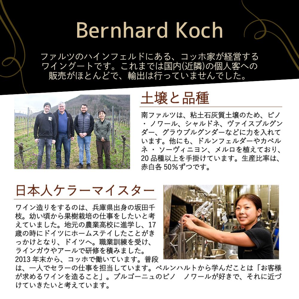 【商品説明】入手困難!高級ドイツ・ファルツ・辛口赤ワイン愛好家大注目!高級ブルゴーニュ・ピノ・ノワール100%フルボディ辛口赤ワイン愛好家も大注目!ドイツ・ファルツの限定畑産のピノ・ノワール種100%フルボディ辛口赤ワイン愛好家大注目!しかもシュペートブルグンダー(ピノ・ノワール)の評価はファルツでもトップクラス!日本人のケラーマイスターがドイツ・ファルツで躍進!ベルハルト・コッホで醸造家を務める坂田千枝さんが日本市場のために仕込んだ特別なワイン!ドイツ・ファルツで躍進する日本人の醸造家が活躍するワイングート!ベルンハルト・コッホの醸造責任者を務める「坂田千枝」さんの名を冠した特別なピノノワールです! 造り手は1610年からファルツのハインフェルトにある家族経営のワイン生産者で、これまでは国内(近隣)の個人愛好家への販売がほとんどで、国外では非常に珍しい造り手!ベルンハルト・コッホ家の元詰ワイン!以下インポーターさんによる説明は『ベルンハルト コッホの醸造責任者を務める「坂田千枝」さんの名を冠した特別なピノノワールです。2023年3月にワイナリーを訪問した際、試飲した 100%樽熟成のピノ・ノワールがあまりにも素晴らしかったため、日本市場限定で瓶詰めしていただくことになりました。現地での試飲だけでなく、坂田さんにお願いして、新樽比率や風味を調整した複数のサンプルを用意していただき、試飲を繰り返して、ついに「これだ!」と納得出来るキュヴェを瓶詰めしていただきました。 スタンダードクラスの「フォン レスと比べると、豊かな果実味に加えて複雑さ、樽からの心地よい風味が感じられます。ハインフェルド、フレムリンゲン、ゴドラムシュタインの3つの村の畑の葡萄を使用しています。土壌は雑色砂岩と石灰岩です。垣根仕立てのコルドン、栽植密度は 5,000 本/ha、収量は45hL/haです。収穫は畑で選別しながら手摘みで行います。100%除梗した葡萄はアルコール発酵前に6度で4日間の低温マセレーションを行います。その後、ステンレスタンクで平均28度に温度コントロールしながら発酵を行います。熟成はフレンチオーク樽(新樽比率 5%)で約18 ヶ月行います。清澄も濾過もしません。』躍進する日本人の醸造家“坂田千枝”さんのなを冠した特別キュヴェ!が正規品の蔵出し作品で限定少量入荷!