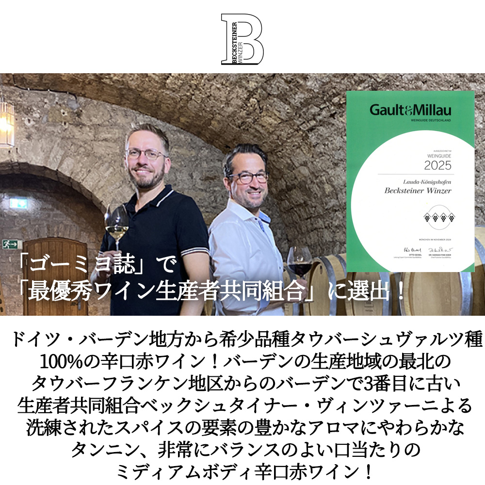 【商品説明】ドイツ・バーデン地方から希少品種タウバーシュヴァルツ種100%の辛口赤ワイン愛好家大注目! バーデンの生産地域の最北となるタウバーフランケン地区 (タウバーフランケン地方は歴史的には1803年まではフランケン地方の一部でした。そのため、フランケンの伝統的ボトル、ボックスボイテルを使用することが認められています。) に位置し、バーデンで3番目に古い生産者共同組合ベックシュタイナー・ヴィンツァーから、かつて絶滅したと考えられていた希少な土着ブドウ品種で珍しいタウバーシュヴァルツ種100% (タウバーシュヴァルツ種はタウバータールの土着品種です。かつては絶滅したと考えられていましたが、1960年頃、国立ワイン栽培教育試験所により繁殖が行われ、これによってこの希少な品種が保存されるようになりました。1980年代以降、タウバーシュヴァルツ種は再び栽培が行われるようになり、繊細な果実味と個性的な赤ワインとして人気があります。) から生まれる希少赤ワイン! 繊細な果実味を持つ個性あふれる一本!がついに登場! 生産者の『ベックシュタイナー・ヴィンツァー(ベックシュタイナー共同組合)はバーデンの生産地域の最北となるタウバーフランケンに位置し、バーデンで3番目に古い生産者共同組合です。1894年8月31日にハインリッヒ・ハンスヤコブ博士と18人の熱意あるワイン生産者によってベックシュタイン村に設立されました。現在は354名の組合員が所属し、合計で276haの畑で栽培が行われています。葡萄畑はベックシュタイン村を中心とする21の村々に広がっています。この地域は、冷涼な気候と貝殻石灰岩の土壌により、繊細でエレガントであると同時に親しみやすいスタイルのワインが生産されています。その安定した高い品質が認められ、「ゴ・エ・ミヨ」2024年版で「最優秀ワイン生産者共同組合(Genossenschaft des Jahres)」に選ばれています。また、タウバーフランケン地方では、何世紀にもわたりワイン造りが行われてきました。日当たりの良い南向きおよび南西向きの斜面に位置する畑、昼夜の気温差、貝殻石灰岩(ムッシェルカルク)の土壌、という良質なワインを造るのに最適な条件が揃っています。タウバーフランケン地方は歴史的には1803年まではフランケン地方の一部でした。そのため、フランケンの伝統的ボトル、ボックスボイテルを使用することが認められています。タウバーフランケンの気候はワインの品質に重要な役割を果たしています。日中は十分な日照量がありますが、夜は気温が下がり涼しくなりますになります。さらに、秋はたいへん温暖で降雨量が少なく、乾燥しています。これによりブドウは長い時間をかけて樹上で熟すことが出来、心地よい酸を保っています。そのため、ワインにはフレッシュな果実のアロマと様々なブーケがもたらされます。』 ダインバッハー・タウバーシュヴァルツ・トロッケン[2023]年・ベックシュタイナー・ヴィンツァー葡萄畑はダインバッハ村に位置し、土壌は貝殻石灰岩(ムッシェルカルク)です!収穫した葡萄を除梗した後、ステンレスタンクに入れて発酵させた後、一部のワインはバリックで12ヶ月熟成させています!熟成後、ステンレスタンクと樽熟成のワインをブレンドします!タウバーシュヴァルツ種は果皮が薄いため、非常に繊細な色合いを持っています!洗練されたスパイスの要素が混ざる豊かなアロマが広がります!樽由来のエレガントな木の要素、やわらかなタンニンが感じられ、非常にバランスのよい口当たりがあります!もちろん正規品の素晴らしい状態で限定少量入荷!