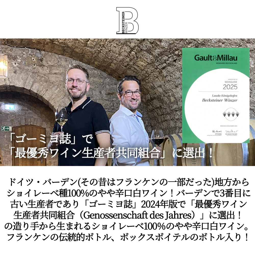 【商品名】デルティンガー・ショイレーベ・ハルプトロッケン[2024]年・ベックシュタイナー・ヴィンツァー(ベックシュタイナー共同組合)・ゴーミヨ誌2024年版で「最優秀ワイン生産者共同組合(Genossenschaft des Jahres)」に選出!・ショイレーベ種100%・バーデン・やや辛口・11.5%【英名】Dertinger Scheurebe Halbtrocken 2024 Becksteiner Winzer Scheurebe 100% BADEN Tauberfranken
