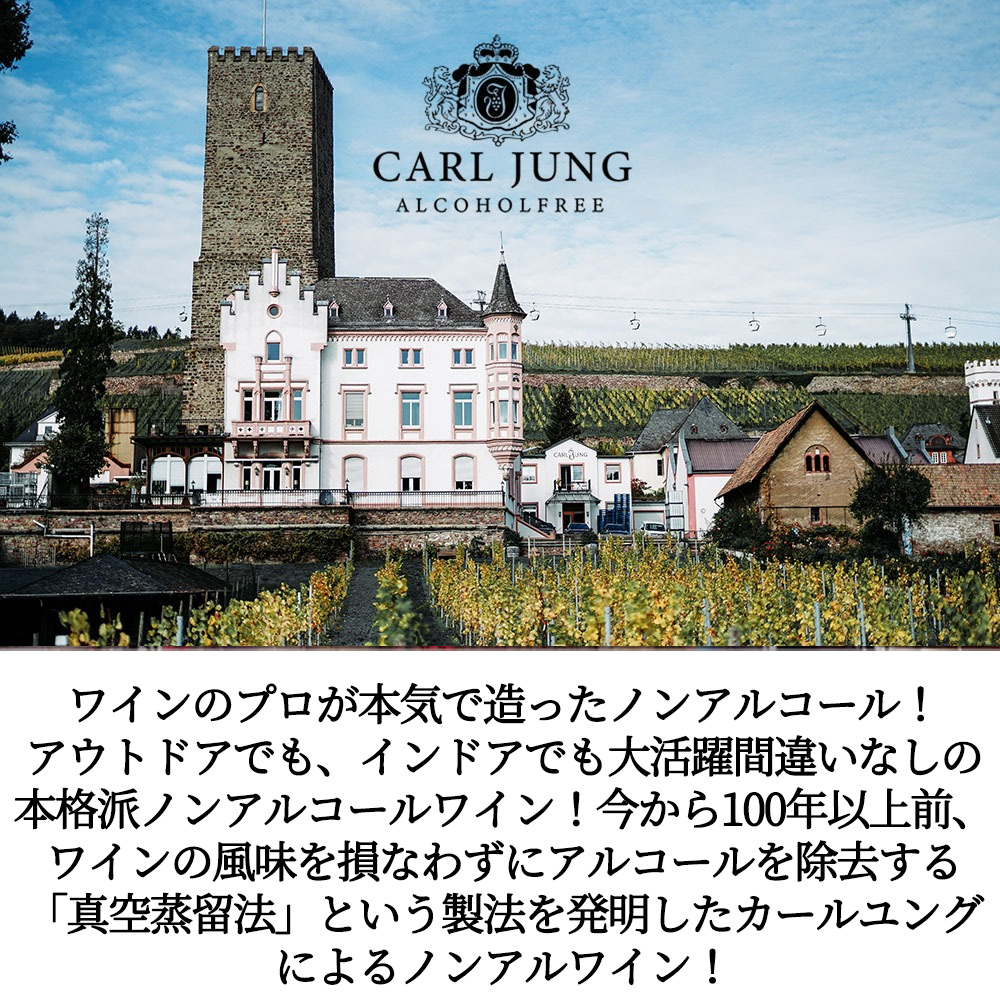 【商品説明】大人気!ドイツ産のノンアルコール・バージョンのリースリング(やや辛口)!ワインのプロが本気で造ったノンアルコール(ワインテイスト飲料)!アウトドアでも、インドアでも大活躍間違いナシの本格派ノンアルコール・リースリング!赤ワインと同じ味わいを追求したノンアルコール飲料! ノンアルコールワインの老舗「カールユング」から、「様々な事情で、アルコールを飲むことができない方にもワインを楽しんで欲しい…」そんな思いから、今から100年以上前、ワインの風味を損なわずにアルコールを除去する「真空蒸留法」という製法を発明したカールユング(20世紀初め、ドイツのワイン醸造家の息子であったカール・ヤングは、アルコールが飲めない人々のために、アルコールを含まないワインについて考えていた。そして1907年、真空蒸留法という先駆的発明をすることになる。これは高所で水の沸点が下がることを伝えたヒマラヤ探検に着想を得てのことであった。低温でワインからアルコールを取り除く技術によって、脱アルコールワインが出来上がった。アルコールを含まなくても楽しんでもらえるよう、ワイン本来の味わいにこだわり、彼はさらなる研究を重ね、脱アルコールワインの品質の安定化と洗練された味わいを実現させた。ユング家はその技術と情熱を受け継ぎ、1世紀以上に渡って積み上げられた知識と経験はボトル1本1本にこめられ、今では30カ国以上の国に届けられています。)! この「カールユング・ノンアルコール・リースリング」は、リースリング種からアルコール分を除去した本格派赤ワイン風ノンアルコール!お酒を控えている方にも楽しんで頂けます!よく冷やしてアウトドアでも、BBQでも、パーティーでも大活躍間違いなしの糖分添加なしのドライな味わい!