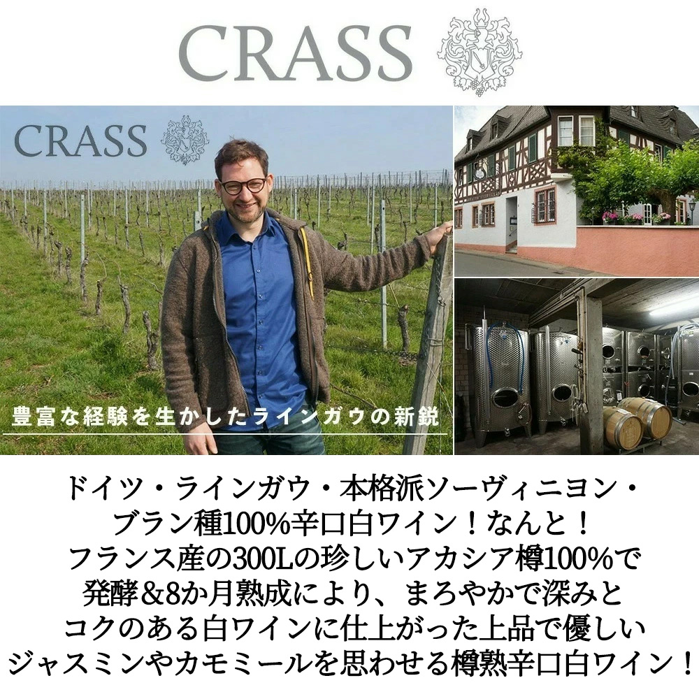 【商品説明】希少!世界的に人気のソーヴィニヨン・ブラン種100%辛口白ワイン! ドイツ・ラインガウ・本格派ソーヴィニヨン・ブラン種100%辛口白ワイン! なんと!フランス産の300Lの珍しいアカシア樽100%で発酵&8か月熟成により、まろやかで深みとコクのある白ワインに仕上がった上品で優しいジャスミンやカモミールを思わせる辛口白ワイン! しかも造り手のワイングート・クラスは、豊富な経験を生かしたラインガウの新鋭でありラインガウ銘醸地エアバッハ村の生産者で1630年からヴィンケル、ハッテンハイム、そして1850年に現在のエアバッハで畑を所有し、現オーナーでありケラーマイスターを務めるマティアス・クラス氏の曽祖父の時代にワイン造りをスタートしました! 2014年に父のヴォルフガングから、マティアスがワイングートを引き継ぎました!1630年にラインガウのヴィンケルでスタートし、その後ハッテンハイム、エアバッハと場所を変え、ワイングートは代々受け継がれてきました!エアバッハに醸造所を構え、ラインガウの1級畑を所有する生産者です! このハルガルテナー・ヘンデルベルク・ソーヴィニヨン・ブラン・トロッケン[2022]年はタウヌス山の森に近い畑ヘンデルベルクからのワインでスレート土壌の急斜面に位置し、平均樹齢は20年です!手摘み100%で収穫した葡萄を圧搾し、フランス産の300Lのアカシア樽(新樽でない)で、14-16度で8週間発酵させます!アカシアはオークよりも目が詰まっており、酸素交換が少なく、樽からの影響が強くなりすぎないため、ソーヴィニヨン・ブランに向いていると考えています!同じ樽で8ヶ月熟成! 白桃を思わせる甘い香り、口に含むと非常に上品でスムーズ、深みとコクが感じられ、とてもエレガントな仕上がりです! このワインについてのインポーターさんのコメントは『蜂蜜のような甘いアロマ、ホワイトペッパーなどのスパイスと鉱物系のミネラルの香りはしっかりと、ジャスミンやカモミールなどの上品で優しいハーブはほんのり感じられます。アタックはまろやかで、厚みもしっかり、木のニュアンスはあまり感じられませんが、このワインが樽で熟成されたことが、ふくよかなアタックから容易に想像できます。長い余韻まで続く穏やかな酸味とライムなど柑橘系の苦みが全体のバランスをとっています。 (2026.3.9 』 豊富な経験を生かしたラインガウの新鋭の手によるもちろん現地のセラー数ヶ月前の蔵出し作品の正規品で限定少量入荷!