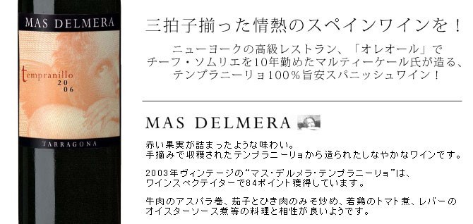 | ■ワインについて | 手摘み100%のテンプラニーリョで造られたD.O.タラゴナ。赤い果実が詰まったような味わい。手摘みで収穫されたテンプラニーリョから造られたしなやかなワインです。 2003年ヴィンテージは、ワインスペクテイターで84ポイント獲得! |