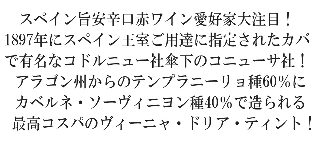 造り手は、1897年にスペイン王室ご用達に指定されたカバで有名なコドルニュー社!のグループのコニューサ社!!熟したベリー系のフルーティーなアロマを持ち、短期熟成からくるモレローチェリーやタバコなどのスパイシーさもわずかに感じさせる調和のとれた味わい ガーネットを帯びたダークチェリー色、豊かな熟したベリー系のフルーティーなアロマにクランベリーなどの赤い果実やスパイス、トーストの香りを持ち、ステンレスタンク熟成からくるモレローチェリーやタバコなどのスパイシーさもわずかに感じさせる調和のとれた味わいとやわらかなタンニンが特徴的。 | ![]() ■葡萄品種:テンプラニーリョ種60%、カベルネ・ソーヴィニヨン種20%、シラー種20% スペイン旨安辛口赤ワイン愛好家大注目!スペイン・アラゴン州からのテンプラニーリョ種60%にカベルネ・ソーヴィニヨン種20%、シラー種20%で造られるミディアムボディ人気!辛口赤ワイン! 造り手は、1897年にスペイン王室ご用達に指定されたカバで有名なコドルニュー社グループのコニューサ社! 熟したベリー系のフルーティーなアロマを持ち、短期熟成からくるモレローチェリーやタバコなどのスパイシーさもわずかに感じさせる調和のとれた味わいと生き生きとしたタンニンが特徴的なミディアムボディ辛口赤ワインが限定でビックリプライス!で少量入荷! |