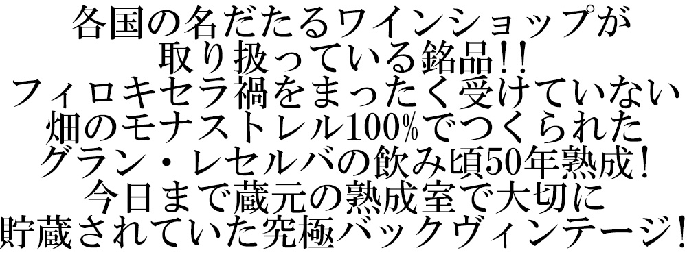 ![]() ボデガス サン イシドロ グラン レセルバ 1974 限定究極秘蔵古酒 D.Oフミージャ プレ DOフミージャ。モナストレル(ムールヴェードル)100%。標高700~800メートルの畑より。平均樹齢30年。 厳格なリュット・レゾネを実践(風も多く乾燥がちの気候で、害虫等の出にくい石灰岩質・砂質土壌のため、化学肥料や農薬は実質的にほとんど必要とされない)。 アメリカンオークで24ヵ月間熟成後、24ヵ月間以上ビン熟成。 バックヴィンテージは、このビン熟成期間が長いことになります。 ビン詰め後今日まで、温度管理された熟成室で大切に貯蔵されていたものです。 古酒ファンの多いイギリスを中心に各国の名だたるワインショップが取り扱う名品が素晴らしい状態で奇跡の限定少量入荷! |
