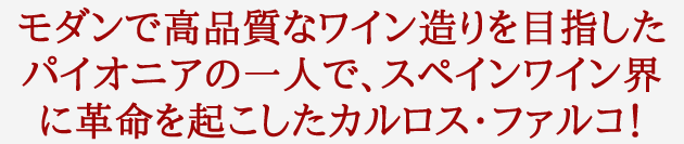 オーナーのカルロス ファルコ氏は、スペイン南部のアンダルシア州の州都、セビージャに生まれました。ルーヴェン大学(ベルギー)で農学を学んだ後、カリフォルニア大学デイヴィス校で最先端の葡萄栽培、醸造について学びました。彼はスペインにおける現代的な葡萄栽培、および高品質ワイン造りのパイオニアのひとりです。