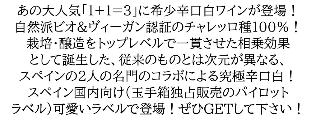 1+1=3 ウ メス ウ ファン トレス ロゼ オーガニック アネイ 2020 ■葡萄の品種:ガルナッチャ・ネグレ種50%,ウル・デ・イェブレ種50% ■収穫:手摘み スペインの2人の名門のコラボによる究極スパニッシュ・ロゼ! ガルナッチャ・ネグレ種50%(1990年植樹)、ウル・デ・イェブレ種(テンプラニーリョのカタールーニャ語。1974年に植樹されたVV)50%のブレンド! スペインのこの価格帯のワインでは珍しく、すべて手摘みで収穫し、ぶどうを厳しく選別!除梗100%! コールド・マセレーション後にピンク色の果汁を抜き取り(セニエ法)、ステンレスタンクで醸造! バラやスミレのような芳香!イチゴやさくらんぼを思わせるチャーミングな味わい!十分なコクがあり、パスタや白身のお肉料理などに幅広く合わせていただけます! 地域最高レベルのぶどうと、地域最高レベルの醸造が一体となった、まさしく「1+1=3」の完成度!