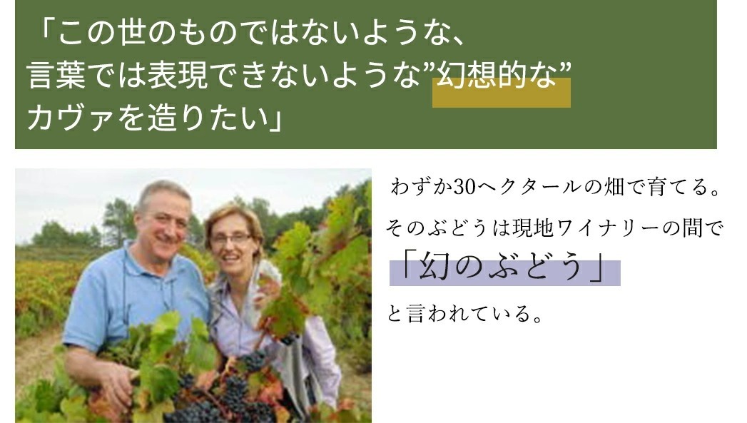 「栽培に、秘訣とかノウハウとかはありません。すべてを完璧にやるだけ」。「この世のものではないような、言葉では表現できないような”幻想的な”カヴァを造りたい」というジョセップ・ピニョルは、趣味も持たず余暇もとらず、シーズン中は1日4時間睡眠でほとんどぶどう栽培のみに生きる求道者です。「幻」と言われるにはそれだけの理由があります。