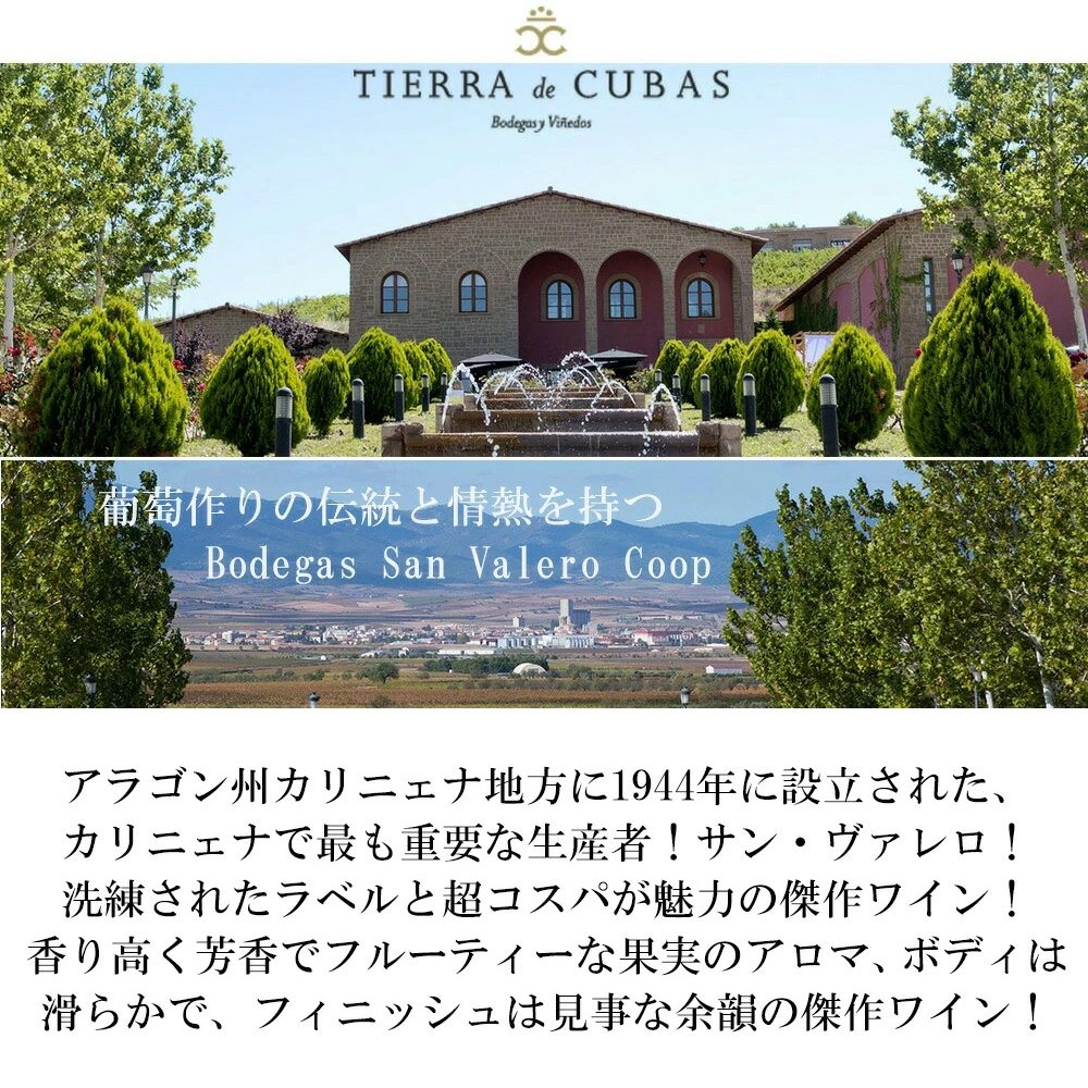 【商品説明】高級スペイン・フルボディ辛口赤ワイン愛好家大注目!超コスパが魅力の傑作スパニッシュ金賞受賞酒! 造り手のボデガス・サン・バレロは、アラゴン州カリニェナ地方に1944年に設立された、カリニェナで最も重要なワイナリーの一つ!500ものワイン生産者達からなる共同組合で、現在スペインに約4,000ヘクタールのブドウ園を所有する協同組合「ボデガス・サン・ヴァレロ」!葡萄作りの伝統と情熱を持つ協同組合として、安定した美味しさ、コストパフォーマンスの良さが評判を呼び、世界中に輸出しているスペインを代表するワイナリーの一つ!改革、伝統の尊重、そして醸造の卓越性!これがボデガス・サンバレロが大切にしているキーポイント!75年以上の伝統的なノウハウと最新の生産管理技術が融合させて造られる彼らの自慢のワインは、スペイン国内だけでなく世界へと輸出され、愛されています! 標高700mに位置する葡萄畑の近くに醸造所を持ち、葡萄の収穫後、すぐに醸造することで高品質なワインが造られています!元々葡萄栽培には優れたDOで少雨、乾燥地帯でありながら、ピレネーからの乾燥した北風「シエルソ」が吹き夏は38度を超える日もあり、冬は5℃に満たない日もある極端な大陸性気候で日中と夜間の寒暖差も激しく、葡萄栽培にうらやましい程恵まれたD.O.P・カリニェナ! このドン・メンド・レゼルバ[2021]年は、厳選したカベルネ・ソーヴィニヨン50%、テンプラニーリョ30%、シラー20%をオーク樽12ヶ月&セラー24ヶ月の合計36ヶ月以上で造られる究極フルボディ辛口赤ワイン!長期熟成からのタンニンの細やかさと滑らかさ、熟成からのブーケによくある単純なテンプラニーリョだけのワインでは無く、より複雑に且つ絶妙に調和と統制の整ったワイン! 香り高く芳香でフルーティーな果実のアロマ、ボディは滑らかで、フィニッシュは見事な余韻の傑作フルボディ・スパニッシュ金賞受賞が大人気ヴィンテージ[2021]年で待望入荷!タンニンが柔らかいので、肉料理全般、赤身の魚をはじめ幅広くマリアージュをお楽しみいただけます!