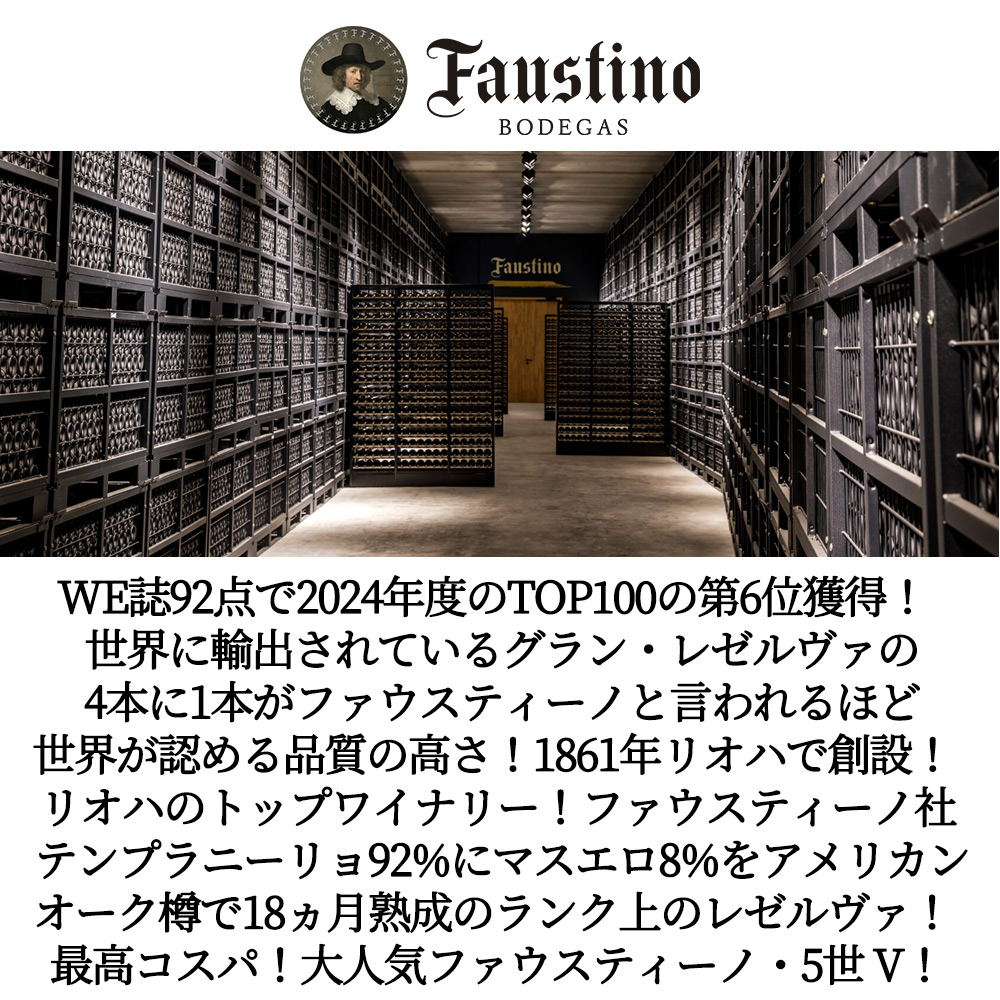 【商品名】ファウスティーノ・5世・V・レゼルヴァ[2018]年・DOCaリオハ・ボデガス・ファウスティーノ家・テンプラニーリョ主体・アメリカンオーク樽18ヶ月熟成・ジェームス・サックリング93点&ワインエンスージアスト誌92点で2024年度のTOP100の第6位獲得・正規品・明治屋輸入品【英名】Faustino V Reserva 2018 Bodegas Faustino DOCa Rioja