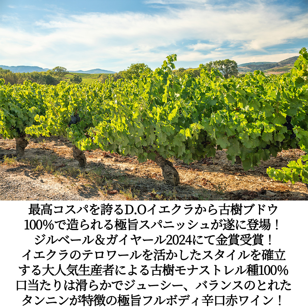 【商品説明】高級スペイン愛好家大注目!モナストレル種愛好家大注目!ジルベール&ガイヤール2024にて金賞受賞!最高コストパフォーマンスを誇るD.Oイエクラから古樹ブドウ100%で造られる極旨スパニッシュが遂に登場! 造り手はムルシア州イエクラを本拠地とする小規模生産者ボデガス・イ・ヴィネドス・デル・メディテラネオ社!ブドウ栽培から醸造、瓶詰め、販売までを一貫して行う手作りワイナリー!この地の土着品種モナストレル種を使用した高品質ワインを生産するため、畑やワイナリーに前衛的な生産技術や設備を導入、この地区の既存のワインナリーとは一線を画する生産を行います! イエクラのテロワールを活かしたスタイルを確立する大人気生産者ヴィネドス・デル・メディテラネオ!(イエクラはスペインで唯一、ひとつの町(イエクラ)からなるD.O.で、最も小さなD.O.の一つで、イエクラの特徴となるのは地ブドウ、モナストレル種の存在!ロバート・パーカー氏がこのモナストレルの偉大さに注目し、2006年にムルシア州を「世界の中でも偉大な地域」と表現したことから、かつて無名であったイエクラの名も世界に名を轟かせた)! モナストレル種といえば、主にスペイン南東部(特にムルシア州やバレンシア州)で栽培されている赤ワイン用のブドウ品種で、フランスではムールヴェードルという名前で知られています! この「ラス・カレータス・モナストレル[2023]年」は、同イエクラを世界に広めたスーパー・ボデガであるボデガス・カスターニョ(ヘクラで有名)との最強タッグワイン(カスターノ社で生産されるワインはどちらかというとモナストレルのトラディショナルなスタイルが中心。その為、それ以外の新たな試みの時流にマッチした製品をこのボデガで生産。口当たりの優しい、非常にエレガントで活気のある近代的なワインが完成。エレガントで柔らかくフルーティーでジューシーな地中海の特徴に濃厚な飲みごたえを充分に備えた個性的なワイン。)! 標高は750mで北南向き!石灰岩からの樹齢30年以上の古樹モナストレル種100%使用!発酵とマセレーションは 10日間、発酵温度 28oC、ステンレススチールタンクでのマロラクティック発酵!深い赤色!チェリー、プラム等、赤い果実の心地よい香り! 口当たりは滑らかでジューシー、バランスのとれたタンニンが特徴の極旨フルボディ辛口赤ワイン!赤身の肉料理全般、ステーキや仔羊などのグリル料理にお勧めです!