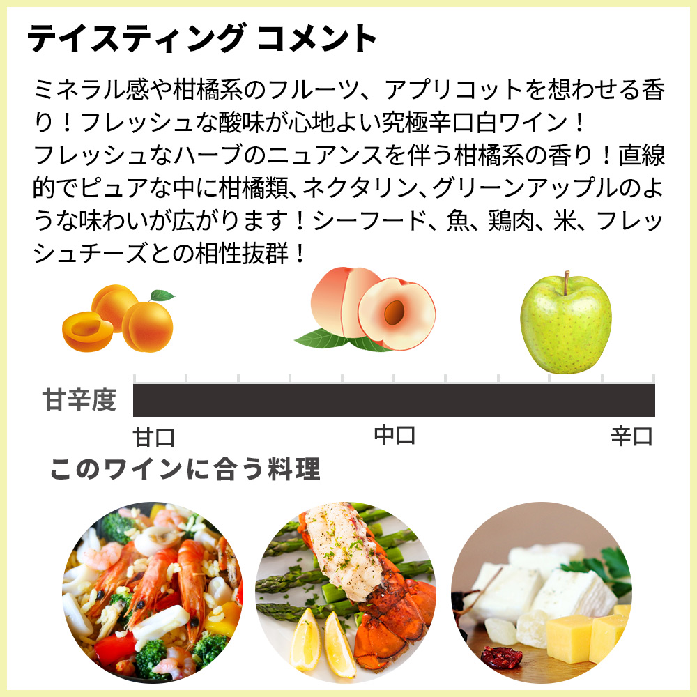 【商品説明】大人気スペイン辛口白ワイン愛好家大注目!アルバリーリョ種100%人気辛口白ワインファン大注目! その品質から世界的に評価の高い「スペインで最も上質な白ワイン」を生み出すアルバリーリョ種! しかも、スペインで最も上質で伝統的な辛口白ワインの産地!D.Oリアス・ヴァイシャスから届いた“海のワイン”! しかもリアス・バイシャスで1番高得点を獲得したワイン! 造り手についてインポーターさんは『アデガス・バルミニョールは1997年に「伝統とテクノロジーの融合」を掲げて設立された、進取の気質に満ち溢れたワイナリーです。アルバリーニョ種から造られる爽やかな白ワインで人気のリアス・バイシャスD.O.の中でも、最もポルトガルとの国境に近いオ・ロサルというサブリージョンに位置しています。設立当初から最新設備の導入に非常に熱心で、品質重視の姿勢から常に高い評価を集めるリアス・バイシャス屈指の造り手です。総面積34ヘクタールの畑はこの地方では比較的大規模になりますが、200以上の契約栽培農家と育むブドウは全て手摘みで収穫し、驚くほど丹念にワイン造りが行われています。また、国際的に人気の高いアルバリーニョ種に加え、他の地品種を守る意識も強く、栽培面積が減少している希少な地ブドウの栽培にも積極的です。テロワールに対する深い愛情と自信に溢れたワイナリーです。リアス・バイシャスD.O.で造られるブドウ品種は約95%がアルバリーニョです。中でも豊富なミネラルを含む土壌から生まれるバルミニョールのアルバリーニョは非常にクリーンで、ピュアな果汁から得られる芳醇なアロマと美しい酸味が特徴的。また、醸造家はガリシア・ベスト・ワインメーカー選出の実力派。1986年にレケーナワイン醸造・ブドウ栽培学校の醸造学部を卒業。2003年には国際社会科学協議会にてワインマーケティング・醸造学・ブドウ栽培学の修士号を取得しました。2007年にはガリシアソムリエ協会よりガリシア・ベスト・ワインメーカーに選出された実力者であり、ガリシア州の5つのD.O.のうち4つ(リベイロ、リベイラ・サクラ、モンテレイ、バルデオラス)にてテイスティング委員を務めた経歴の持ち主です。アルバロ・ブエノ氏によって手掛けられたワインは国内・国外問わず多くの品評会で評価を得ており、ガリシア州政府公認のコンクールでは、300以上のガリシアワインの中からベスト・ガリシア・ワインに選ばれています。近年では、ガリシア州内の4つのD.O.で有名ワイナリーのコンサルタントを務めています。』 このバルミニョール・アルバリーニョ[2024]年でデキャンター ワールド・ワイン・アワード2025にて97点でプラチナ賞の快挙 (リアス・バイシャスで1番高得点を獲得したワイン) ! 変成岩シスト、丸い小石の多い砂質土壌からの樹齢35-40年のアルバリーニョ種100%をステンレスタンク熟成で造られるミネラル感や柑橘系のフルーツ、アプリコットを想わせる香り!フレッシュな酸味が心地よい究極辛口白ワイン! フレッシュなハーブのニュアンスを伴う柑橘系の香り!直線的でピュアな中に柑橘類、ネクタリン、グリーンアップルのような味わいが広がります!シーフード、魚、鶏肉、米、フレッシュチーズとの相性抜群!リアス・バイシャスで1番高得点を獲得したアルバリーニョぜひご堪能下さい!