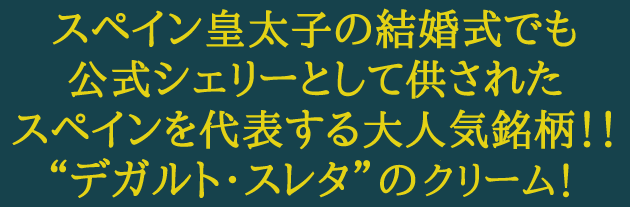 ![]() デルガド・スレタ クリーム モンテアグードスペイン国内で絶大な人気を誇り、スペイン皇太子の結婚式の公式シェリー酒に選ばれる(ラ・ゴヤ)ほどの銘柄デルガド・スレタ。このクリームは柔らかな甘口仕立てとなっています。アルコールは17.5パーセント。 |