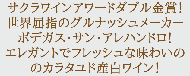 ![]() バルタサール・グラシアン エル・ディスクレト 2021年 ボデガス・サン・アレハンドロ樹齢40年以上のビウラ種50%とガルナッチャ・ブランカ種50%。やや緑がかった淡い黄色で白い花やシトラス、桃など爽やかな香りが感じられます。アルコールと酸のバランスがよく、エレガントでフレッシュな味わい。魚介類のお料理やマッシュルームを使った料理との相性バッチリ! |