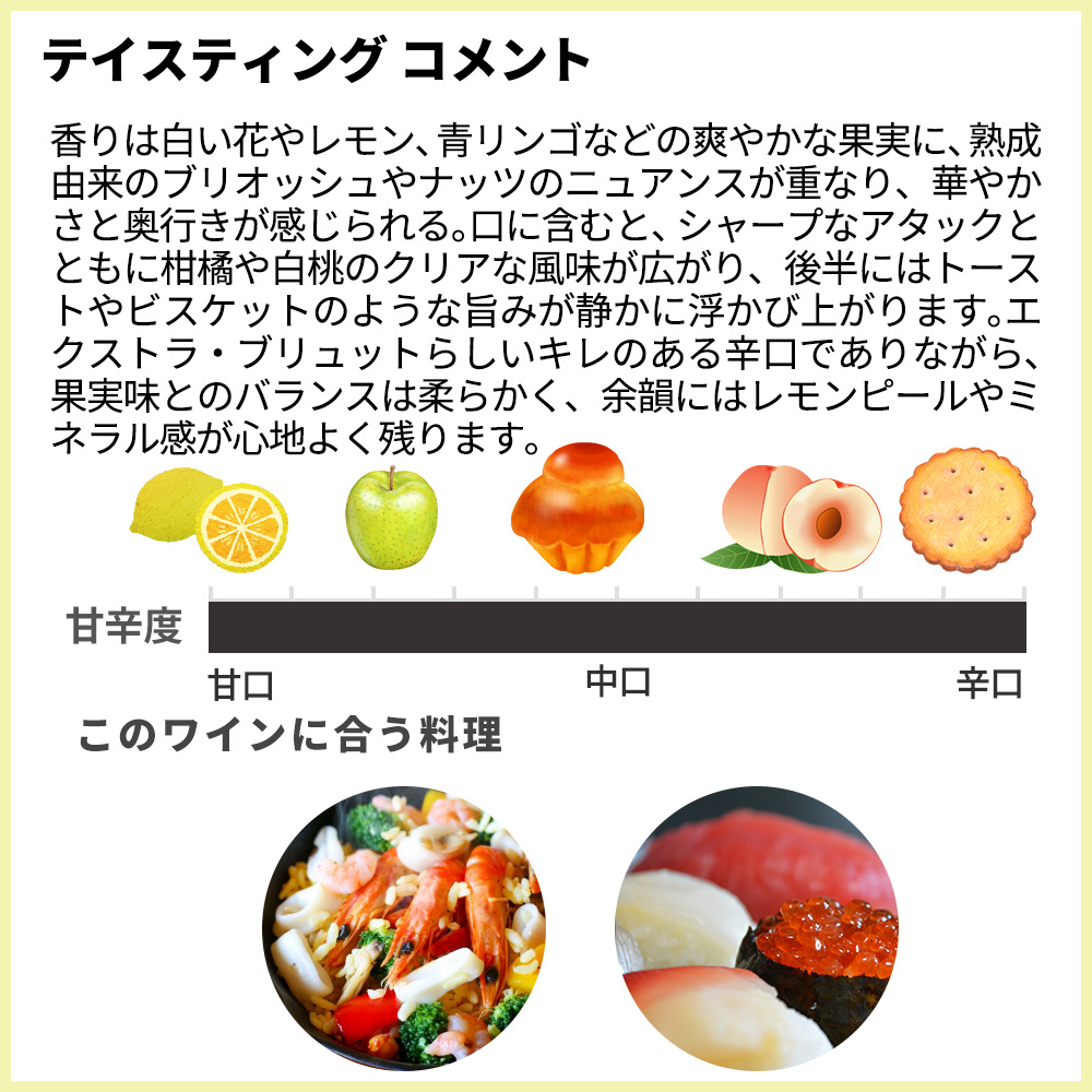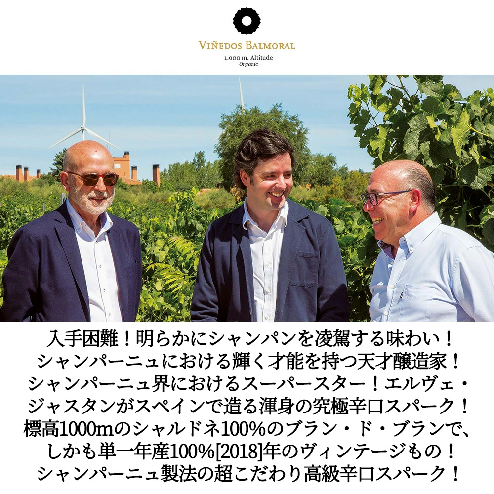 【商品説明】入手困難!高級シャンパーニュ愛好家垂涎!高級スパークリングワイン愛好家大注目! イギリスのデカンタ誌大注目!シャンパーニュにおける輝く才能を持つ天才醸造家!シャンパーニュ界におけるスーパースター! トップシャンパンメゾンとしては最年少24歳でシャンパーニュ・デュヴァル・ルロワの醸造長となり、退任後はトップシャンパンメゾンのコンサルタントを開始!自然派ビオディナミの方法論を独自に昇華させた「革命的醸造法」をもって、クリスタルで有名なルイ・ロデレールや、ブノワ・ライエ、フルーリー・ペール・エ・フィスなど名だたるシャンパーニュ生産者に醸造コンサルタントとして力添えをしてきた“奇才”!!エルヴェ・ジェスタンがスペインで渾身の究極スパークリングを造った! シャンパーニュにも勝るスパークリングを造るというジャスタン氏の想いが詰まった瓶内2次発酵 (シャンパーニュ製法) の超こだわり高級辛口スパークリングワイン! しかも標高1000mのシャルドネ100%のブラン・ド・ブランで、しかも単一年産100%のヴィンテージもの! 「冷涼高地産らしい引き締まった酸と繊細な泡が特徴の、非常にエレガントなスパークリングワイン。香りは白い花やレモン、青リンゴなどの爽やかな果実に、熟成由来のブリオッシュやナッツのニュアンスが重なり、華やかさと奥行きが感じられる。口に含むと、シャープなアタックとともに柑橘や白桃のクリアな風味が広がり、後半にはトーストやビスケットのような旨みが静かに浮かび上がります。エクストラ・ブリュットらしいキレのある辛口でありながら、果実味とのバランスは柔らかく、余韻にはレモンピールやミネラル感が心地よく残ります。」!旨みと泡が溶け込んだ極上の泡!柑橘系のアロマに深みのある果実味から奥行きの長い余韻へと続く、明らかにシャンパンを凌駕する味わい!シャンパーニュの至宝! エルヴェ・ジャスタン氏がスペインの地で造る高級シャンパンも顔負けの超こだわりのもと造る渾身の究極辛口スパークリングワインが豪華箱入りで待望の少量入荷! 食事に寄り添う洗練された味わいで、和食やシーフードとも相性抜群です!