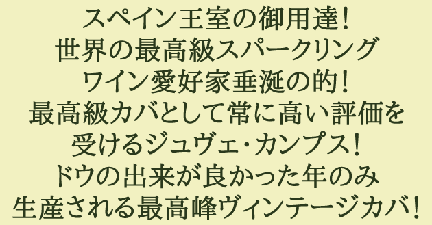 ![]() ジュヴェ・カンプスは、1921年に設立された家族経営のカバメーカーで、ペネデスに450ヘクタール以上の自社ぶどう園を所有します。ワイン造りには、ぶどうに無理な圧力をかけずに抽出されたフラーランジュースのみを使用し、果実本来の豊かな酸味とミネラルを表現しています。熟成には最低24ヶ月から60ヶ月を費やし、レゼルヴァ及びグラン・レゼルヴァクラスの製造に特化しているのも特徴。収獲や動瓶等、ジュヴェ・カンプスは商品の最終製造工程に至る迄、手間暇惜しまずに全て手作業により生産を行っています。 ![]() スペイン国内では最高級のカバとして常に高い評価を受けており、高級スパークリングワイン市場のリーディングブランドとして知られています。尚、カバの他にもスティルワイン「エルミタ・デスピエール」、「カサ・ヴェーリャ・デスピエール」も生産・販売しております。ジュヴェ・カンプスカバはスペイン王室でも愛飲さてれおり、「最高品質の商品をプレステージの高い場所での販売」をポリシーとしています。 ![]() ・手間暇かけた製造工程(手作業によるぶどうの収獲、動瓶等)・圧搾をせず、フリーランジュースのみ使用・フィルタリングは行わずデキャンティングに徹底・単一ヴィンテージのみ使用・熟成にかける期間は24ヶ月から60ヶ月・スペイン国内の高級スパークリングワイン市場で50%近くのシェアを確保 |