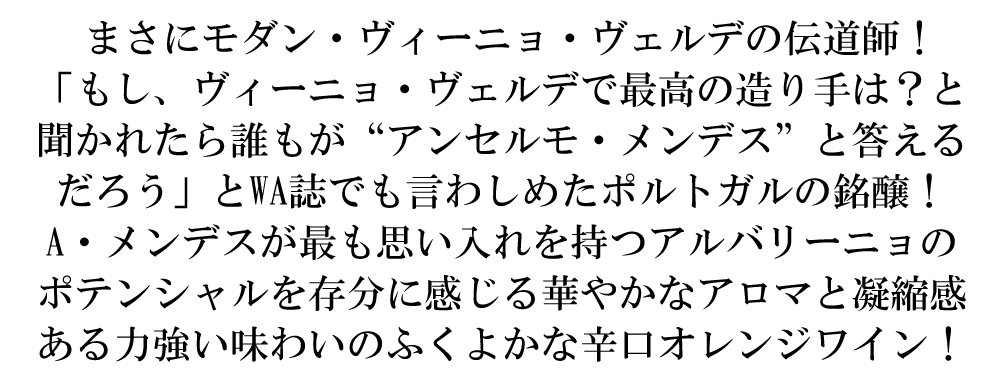 ![]() アンセルモ メンデス氏が1998年にモンサオン&メルガッソ地区に設立したワイナリー。モンサオンに生まれ育ち、幼少時代よりワイン造りに親しんできたアンセルモ メンデス氏は、農業工学、醸造を学んだ後、ポルトガル内外でコンサルタントとして活躍、いくつものプロジェクトを成功に導きました。そしてついに自身のアルヴァリーニョ造りを開始しました。 ![]() 当時はヴィーニョ ヴェルデといえばやや甘口で低アルコールの微発泡ワインが中心でしたが、アンセルモ氏は木樽での発酵やシュール リーでの熟成を取り入れた本格的な辛口スティルワインを生み出し、国際的にも非常に高い評価を獲得しました。彼の活躍はヴィーニョ ヴェルデ全体の品質向上にも貢献し、今やヴィーニョヴェルデのみならずポルトガルを代表する造り手として高く評価されています。 ![]() ミーニョ地区の土着品種でもあるアルヴァリーニョ、リマ川沿いの歴史ある品種、ロウレイロ、ドウロ川沿いヴィーニョ ヴェルデ南部で造られるアヴェッソの3種の白ブドウと黒ブドウ1種を主に栽培しています。白ブドウはすべて自社畑で、栽培時には丁寧な剪定により収量を制限。ブドウが完全に熟したタイミングを見極めて収穫を行います。醸造は非常に優しい力で果実をプレスし、低温で発酵。白はすべてマロラクティック発酵を行わずに仕上げます。 | ![]() ■ぶどう品種:アルヴァリーニョ種100% ■土壌:石灰質土壌 ■収穫:手摘み100% ポルトガル辛口オレンジワイン愛好家大注目!造り手のアンセルモが最も注力するアルヴァリーニョ種100%で造られるDOCヴィーニョ・ヴェルデ辛口白ワイン(オレンジワイン)愛好家大注目! アンセルモ・メンデスが最も思い入れを持つアルバリーニョ100%の華やかなアロマと凝縮感のある力強い味わいのふくよかな辛口オレンジワインがついに入荷! アーモンドやヘーゼルナッツ、スパイスやドライアプリコットなどの力強いアロマ!骨格と長い余韻があり、複雑な旨味を感じます! アルヴァリーニョ種のポテンシャルを存分に感じるワインが限定で正規品で極少量入荷!サーヴ温度は6~12度がお勧めです。 |