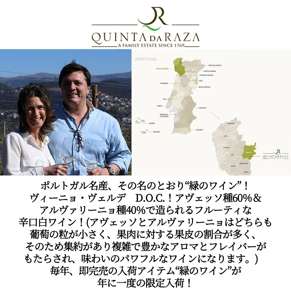 【商品名】ヴィーニョ・ヴェルデ・アヴェッソ・アルヴァリーニョ [2021]年・蔵出し限定品・キンタ・ダ・ハーザ元詰 (ジョゼ・ディオゴ・テイシェイラ・コエリョ家(5代目))・D.O.C.ヴィーニョ・ヴェルデ・(アヴェッソ種60%&アルヴァリーニョ種40%)・ポルトガル・ヴィーニョ・ヴェルデ【英名】Vinho Verde Quinta da Raza Avesso Alvarinho 2021 D.O.C.Vinho Verde