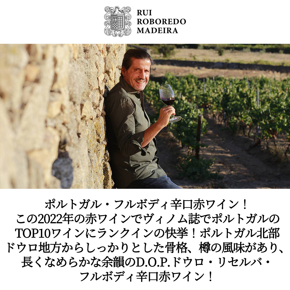 【商品説明】ポルトガル・フルボディ辛口赤ワイン愛好家大注目!この2022年の赤ワインでヴィノム誌でポルトガルのTOP10ワインにランクインの快挙!ポルトガル北部ドウロ地方からしっかりとした骨格、樽の風味があり、長くなめらかな余韻のD.O.P.ドウロ・リセルバ・フルボディ辛口赤ワイン! (ポルトガル北部ドウロ地方で造られる格上キュヴェの辛口赤ワインで、「D.O.P.(原産地保護呼称)(旧DOC)」かつ「レゼルバ(熟成・品質の基準を満たした特別キュヴェ)」の表示を持つものを指します。「世界的に注目を集めるドウロ」はドウロは元々ポートワインを造っていたエリアで、良質な葡萄を使った辛口ワインが造られるようになってきました。近年、「ワインスペクテーター」でも、高い評価を得ています。) しっかりとした骨格、樽の風味があり、長くなめらかな余韻! しかも造り手のルイ ロボレド マデイラ (オーナー兼エノロゴ、ルイ・ロボレド・マデイラ家) は30年間の絆を持つ農家からの葡萄 (トウリガ ナショナル種、トウリガ フランカ種、他) 、100%管理の5つのキンタの葡萄、4つの農協からの葡萄を使っています!また、各キンタの名前でボトリングした残りのワインを、カステロ ダルバにブレンドします!ルイは、4つの農協のコンサルタントをしていて、葡萄からワイン造りまで全ての行程が彼の指示に沿って行なわれます! まさに地元品種にこだわったワイン造り/自社畑+100%管理する5つのキンタ ドウロ スペリオーレDOPの北東向きのテラスの畑で、シスト土壌!標高は300mです!葡萄の平均樹齢は20年です!灌漑をせずに栽培しています!100%除梗、破砕します!28度に温度管理しながら、小容量のステンレスタンクで発酵させます!50%はフレンチオーク樽、50%はステンレスタンクで8ヶ月熟成させます! トウリガ フランカのワイルドベリーやロックローズ(半日花)の香り、ティンタ ロリスのスパイスや赤い果実、そしてトウリガ ナショナルのスミレの花のような非常にフレッシュでエレガントなアロマが、複雑に混ざりあっています! (香り:黒系果実、プラム、ワイルドベリー、スパイス、スミレ、樽由来のヴァニラやロースト香、木質のニュアンスなど。味わい:凝縮した果実味、しっかりした酸とタンニン、樽熟成による厚みとまろやかさがあり、余韻にスパイスと樽香が長く続くスタイルが典型的集約された果実味と、骨格のしっかりとしたリッチな味わいです。ワインとのマリアージュは牛・ラムなどのグリル、ロースト(香草・ニンニクを効かせたもの)煮込み料理(ラグー、ポルトガル風肉料理、スパイスを効かせたトマトベースの煮込み)熟成ハードチーズ(マンチェゴ系、コンテ、長期熟成ゴーダなど)。) しかもこのワインでヴィノム誌でポルトガルのTOP10ワインにランクイン (BEST OF PORTUGAL (第7位) ) 獲得!もちろん正規品の素晴らしい状態で限定入荷!