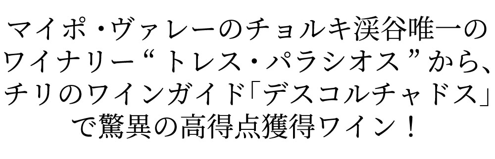 ![]() トレス・パラシオス“ファミリー・ヴィンテージ”メルロー[2020]年・D.Oマイポ・ヴァレー・(チョルキ渓谷唯一のワイナリー)・自社畑100%の手摘み100%のメルロ100%を小樽バリック12ヶ月熟成・「デスコルチャドス」で驚異の高得点獲得ワイン・(フルボディ・赤)・正規品 ■ 使用品種:メルロー 何年もの調査の結果、最も優れた葡萄ができる最良の区画を選び、その畑の葡萄から造られています。 収穫は手摘みで行い、除梗、破砕します。発酵前に10日間コールドマセラシオンを行います。 アルコール発酵は27度以下にコントロールしながらステンレスタンクで行い、その後、225Lのバリック(新樽35%)に移し、12ヶ月熟成させます。 ワインそのものの良さをキープするためにフィルターなしでボトリングします。 紫を帯びた濃い赤色。非常にエレガントでシルキーな口当たりです。 濃厚な果実味の中に感じるバニラやコーヒー、樽のニュアンスがワインに優雅さを与えています。 |