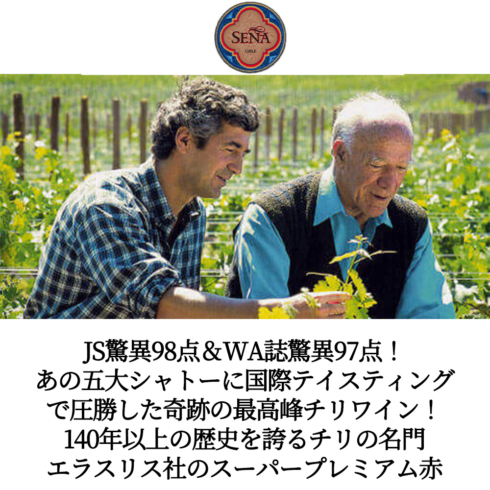 【商品名】セーニャ 2016 エデュアルド チャドウィック&ロバート モンダヴィ チリ アコンカグア ヴァレー 赤ワイン ワイン フルボディ 辛口 750ml 【英名】Sena 2016 Colchagua Valley (Chile) 【商品説明】入手困難!高級チリ・フルボディ辛口赤ワイン愛好家大注目!世界のワイン愛好家大注目!あの五大シャトー(ラフィットやラトゥール、マルゴー)に国際テイスティングで圧勝した奇跡の最高峰チリワイン!140年以上の歴史を誇るチリの名門エラリス社のエドゥアルド・チャドウィック氏とカリフォルニアワインの父と呼ばれるロバート・モンダヴィの最強タッグの情熱が融合して誕生した1995年初リリースのチリの高級スーパープレミアムワイン「セーニャ」(セーニャとは“際立つ卓越した印”“シグネチャー”といった意味のスペイン語に由来)!2004年にドイツ・ベルリンで開催されたブラインド・テイスティングで、ボルドー五大シャトー(ラ・トゥール、ラフィット、マルゴー)を抑え、世界第2位を獲得(V.Tはセーニャ2001年)!また、2006年のリターン・マッチ(ベルリン・テイスティング・イン・トウキョウ)でもセーニャの2000年がシャトー・ラトゥール2000年に次ぐ第2位を獲得(マルゴー2000年、ラフィット2000年に圧勝)以来、世界中のワイン愛好家を魅了し続ける超高級セーニャ!(2004年からはエドゥアルド・チャドウィック氏の単独所有)チリの首都サンチャゴから北へ約100km、太平洋から約41km内陸に入ったアコンカグア・ヴァレーにある「セーニャ・エステート」からのカベルネ・ソーヴィニヨン55%、マルベック20%、プティ・ヴェルド12%、カルメネール8%、カベルネ・フラン5%をフレンチオーク樽で20~22ヶ月熟成(75%新樽)で造られる究極フルボディ辛口赤ワイン!「セーニャは、ムートン・ロートシルトやハーランといった非常に名声ある生産者がつくるトップワインの果実の凝縮感、ストラクチャー、力強さの全てを兼ね備えている」とジェームス・サックリングで大注目し、この2016年で驚異の98点でコメントは「ブラックベリーとブルーベリーのアロマが立ち上る。フルボディ、ベルベットのようなタンニン。ゴージャスなテクスチャー。非常にピュアな果実味。前ヴィンテージよりも明るく、より根源的なセーニャ。」と絶賛!さらにワインアドヴォケイト誌過去指折り驚異97点獲得でコメントは「本当に素晴らしい2016年のセーニャは、ロバート・モンダヴィとエドゥアルド・チャドウィックのジョイント・ベンチャーとしてスタートし、現在はチャドウィックの指導とワインメーカー、フランシスコ 「パンチョ 」ベティグの素晴らしい手腕の下で続いているこのエステートで生産される最高級ワインになる可能性が非常に高い。ブドウは2016年の後半に収穫され、最終的なブレンドはカベルネ・ソーヴィニヨン55%、マルベック20%、プティ・ヴェルド12%、カルメネール8%、カベルネ・フラン5%で、マルベックが多く、カルメネールは以前よりかなり少なくなっている。アルコール度数は 「わずか 」13.5%で、傑出した酸とフレッシュさ、全体のバランスとエレガンスがあり、これまでのヴィンテージを凌駕している。12%はオークのフードルで熟成され、残りはバリック(新樽73%)で22ヶ月熟成された。それでもワインは樽香がなく、ハウス・スタイルの中で調和がとれていてエレガントである。真面目で辛口、エレガントで、甘さの譲歩は一切ない。ミネラリーで深遠な赤のブレンド。」と激賞!濃い色調を湛え、リッチで凝縮感のある複雑で豊かな香りとエレガントな味わいのワイン、構成のしっかりしたスーパープレミアムチリワイン!今やチリを代表する高級セーニャの高評価ヴィンテージ[2016]年が正規代理店輸入品で限定で少量入荷! 【タイプ】赤・辛口 【テイスト】フルボディ 【生産年】2016 【生産者】エデュアルド・チャドウィック& ロバート・モンダヴィ 【生産地】チリ/アコンカグア/アコンカグア・ヴァレー 【品種/セパージュ アッサンブラージュ】カベルネ・ソーヴィニヨン55%、マルベック20%、プティ・ヴェルド12%、カルメネール8%、カベルネ・フラン5% 【内容量】750ml 【JANコード】0600001002944