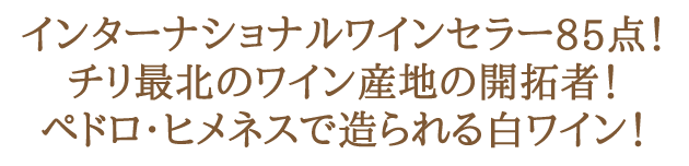 ![]() ビーニャ・ファレルニア ペドロ ヒメネス レセルバ 2024年明るい麦わら色。魅力的な花の香り。ミネラル、見事な果実味とのバランス!生き生きとしていてドライで飲みやすい辛口白ワイン。 |