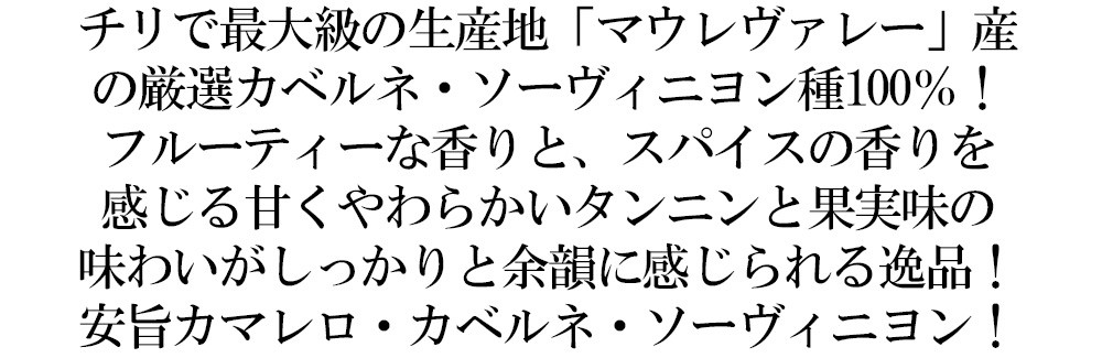 ![]() カマレロ・カベルネ・ソーヴィニヨン フルーティーでやわらかタンニンの辛口赤ワイン!造り手はサンチアゴの南方約285km、地中海性気候で、昼夜の寒暖の差が激しく、冬季は雨が多く夏季は乾燥しているマウレ・ヴァレーの中心にワイン畑が位置し砂質ロームと砂層で構成された火山灰土壌が特徴のおよそ330ヘクタールの畑からのカベルネ・ソーヴィニヨン種100%!チリで最大級の生産地「マウレヴァレー」産!人気のカベルネソーヴィニヨン100%のこのワインはフルーティーな香りと、スパイスの香りを感じる甘くやわらかいタンニンと、果実味の味わいがしっかりと余韻に感じられる人気辛口ミディアムボディ赤ワインがカッパのようなカメのカマレロ(スペイン語でウェイターの意味)のかわいい華やかなラベルで、リーズナブルな価格。 |