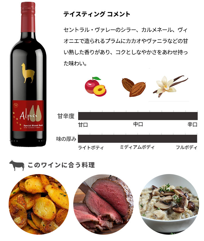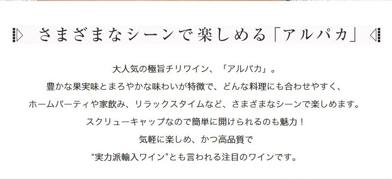 【商品説明】チリ辛口赤ワインファン大注目!旨安ワイン愛好家に朗報!チリ超お買い得のハイ・コスパ究極辛口赤ワイン!あのアルパカに新アイテム“スペシャル・ブレンド・レッド”が新発売!1942年創業のサンタ・ヘレナ社は、いち早く海外進出を果たしたチリワインにおける輸出ブランドのパイオニア!今は世界52ヵ国以上で愛飲されており、長年培ったワイン造りのノウハウをいかしつつ、より高い品質を目指し活動を開始したサンタ・ヘレナ社のワインは、今後ますます世界のワイン愛好家の注目を集めていくこと間違いなし!チリをはじめ南アメリカを代表する動物である“アルパカ”!手頃な価格ながらサンタ・ヘレナ社が自信と想いを込めてお届けする本格派ヴァライエタルワインのランク上のスペシャル・ブレンド・レッド!2014年ヴィンテージのカベルネ・メルローで月刊誌「一個人」2013年11月号で極旨ワイングランプリ第3位獲得!このアルパカ・スペシャル・ブレンド・レッドは、セントラル・ヴァレーのシラー、カルメネール、ヴィオニエで造られるプラムにカカオやヴァニラなどの甘い熟した香りがあり、コクとしなやかさをあわせ持った味わい!極上辛口フルボディ赤ワインが遂に登場!
