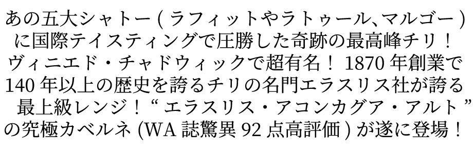 ![]() 名門エラスリスが誇る最上級レンジ!“アコンカグア・アルト”!あの五大シャトー(ラフィットやラトゥール、マルゴー)に国際テイスティングで圧勝した奇跡の最高峰チリワイン!偉大なヴィニエド・チャドウィックで超有名!1870年創業で140年以上の歴史を誇るチリの名門エラスリス社(チリの大統領を4人輩出してきた名家)! ![]() 世界で最も優れたカベルネを生み出す“カベルネの聖地”チリの首都サンチャゴから北へ約100km、太平洋から約41km内陸に入ったアコンカグア・ヴァレーをほぼ独占所有!現在6代目当主であるエドゥアルド・チャドウィック氏が最高醸造責任者フランシスコ・バエティッグ氏とともに造る、もはや伝説!チリ最高峰ヴィーニャ・エラスリスによるアコンカグア・アルト・シリーズの大人気カベルネ・ソーヴィニヨン! |