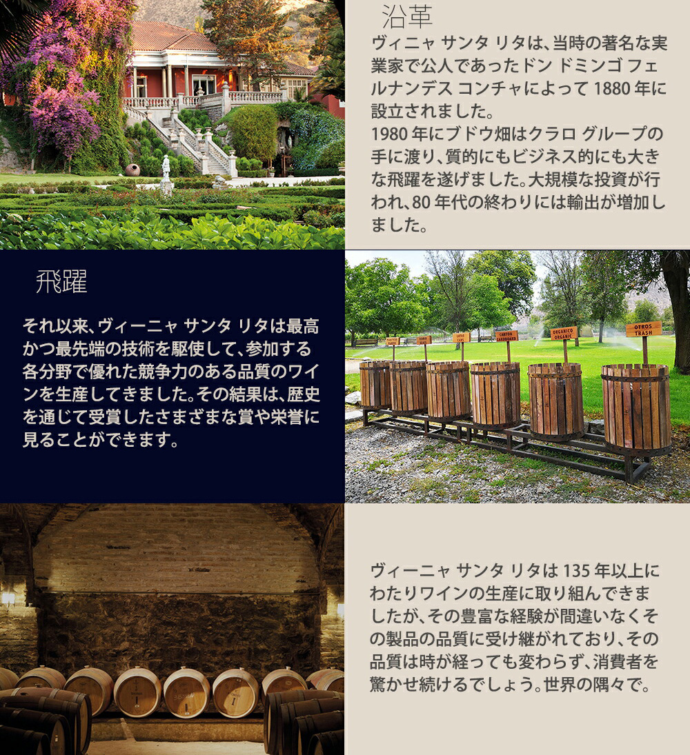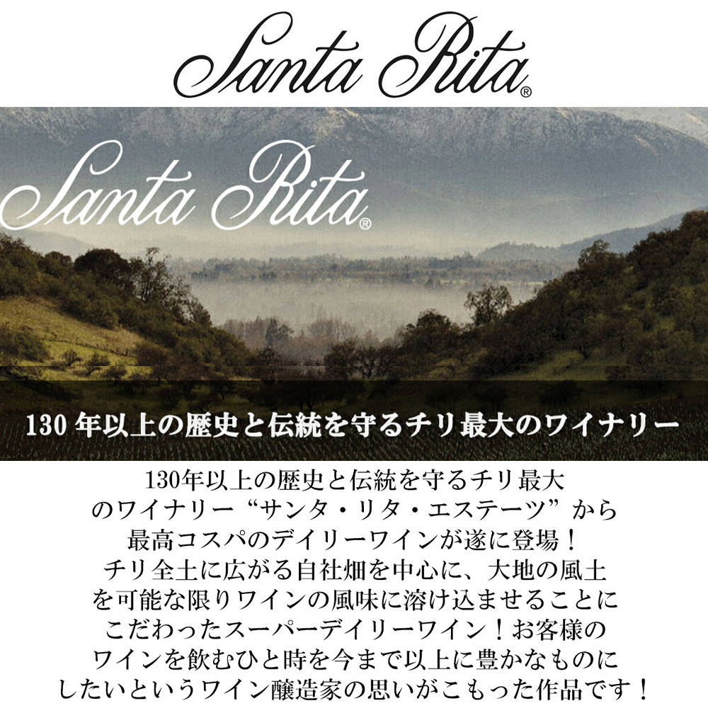 【商品説明】チリワイン愛好家大注目!旨安赤ワイン愛好家大注目!130年以上の歴史と伝統を守るチリ最大のワイナリー“サンタ・リタ・エステーツ”から最高コスパのデイリーワインが遂に登場!サンタ・リタ・エステーツは1880年創設の長い歴史を持つワイナリー!当初からフランスワイン醸造技術を導入し、ヨーロッパの伝統的な生産方法をしっかりと守った、確かなワイン造りを踏襲しているチリ最大規模のワイナリーのひとつ!2000ヘクタール以上の自社ぶどう畑を所有し、レセルバ以上のワインに関しては全て自社ぶどうのみを使用し、醸造を行っているワイナリー!サンタ・リタ社のワイナリー名の由来は、14~15世紀のイタリアに実在した聖人“カッシーアの聖リタ”!イタリアで「枯れた葡萄」を蘇らせたという奇跡の逸話をもつキリスト教の聖者「サンタ・リタ」という女性です!「チリ国内を南北約4000kmを走るアンデス山脈。日本の全長より長いそのアンデスの山から吹き下ろされる風は病気からぶどうを守る自然の力である。また、頂に積もる雪から生まれる雪解け水は、ぶどうの健全な生育に欠かせない。そして、魅惑的な香りや果実味をもたらすのは、昼夜の大きな寒暖差だ。これらアンデスの恵みをしっかりと受け止めて、ぶどう作りにいかすには、南北各地のぶどう産地に畑を持ち、その土地を理解することで初めて実現する。ぶどうは、土地を選び、土地はまたぶどうを選ぶ。アンデスの大地という名のサンタ・リタ・テラ・アンディーノは、チリ全土に広がる自社畑を中心に、大地の風土を可能な限りワインの風味に溶け込ませることにこだわったスーパーデイリーワイン。チリワインを飲み続けた人だからこそその奥行きをひと口目から感じられる、チリワインユーザーのネクストステージのワイン。お客様のワインを飲むひと時を今まで以上に豊かなものにしたいというワイン醸造家の思いがこもった作品です。」このテラ・アンディーナ・アンデスの大地・カベルネ・ソーヴィニヨン[2024]年は、チリ・DOセントラル・ヴァレー内のカベルネ・ソーヴィニヨン85%、メルロー15%使用!ぶどうは厳密に成熟度に関するモニタリングと収穫前のベリーのテイスティングに従って収穫!収穫後、ぶどうはセラーに運ばれ、梗を除去し、優しく破砕した後、直接発酵タンクに移されます!発酵中は、マストの温度は25度から28度で保持されます!異なる畑のワインがブレンドされた後、ワインはステンレスタンク内でフレンチオークチップおよびアメリカンオークチップとともに熟成され、その後瓶詰めされ、リリース!鮮やかなルビーレッドの色合いで、フレッシュなチェリーやブラックベリーのようなフルーティな香りが魅力的!それに加えて、キャラメルやトフィーのような複雑な香りも持ち合わせています!口当たりはフレッシュで、タンニンは角がなく非常に滑らかで、ジューシーなフィニッシュを残してくれます!最高コスパのデイリーワイン“テラ・アンディーナ・アンデスの大地・カベルネ・ソーヴィニヨン”が待望入荷!ビーフシチューなど煮込み料理やお肉料理全般と相性抜群です!