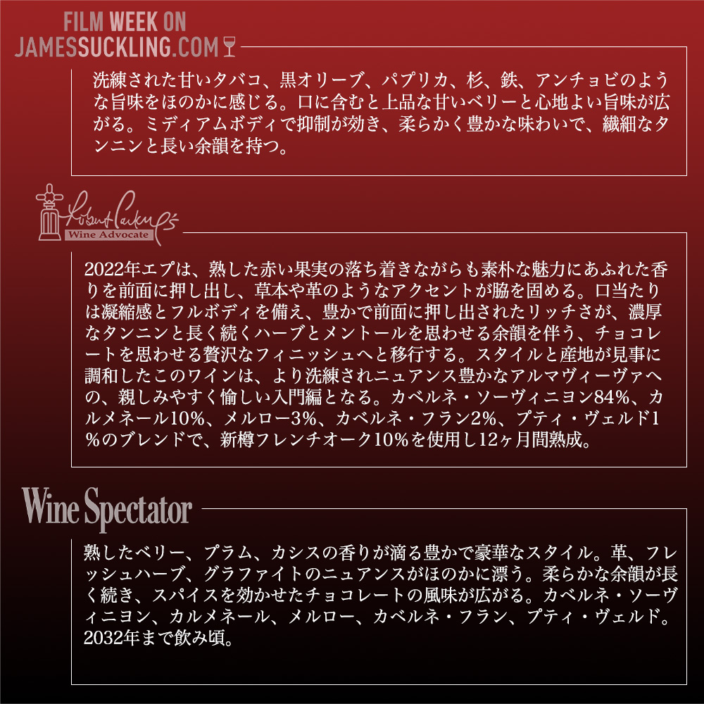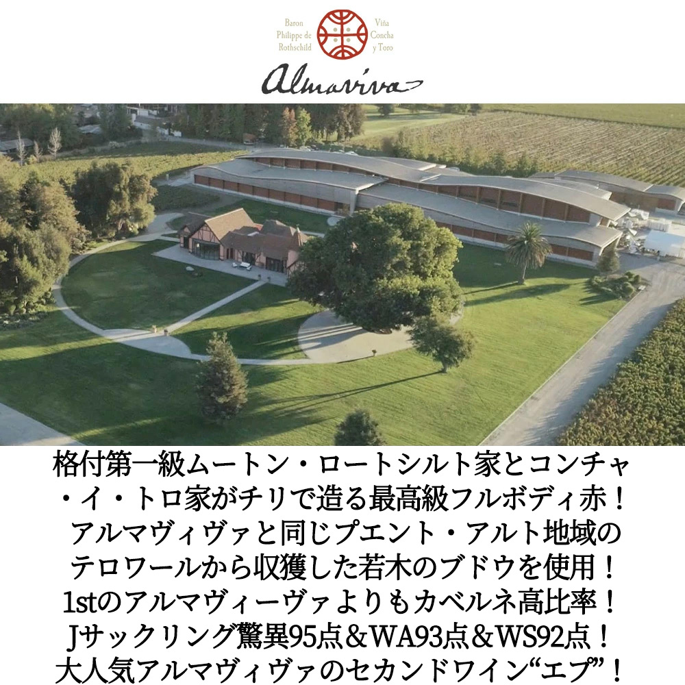【商品説明】世界のフルボディ辛口赤ワイン愛好家垂涎!アルマヴィーヴァ愛好家大注目! 究極スーパープレミアムワイン!メドック格付第一級のシャトー・ムートン・ロートシルト家 (バロン・フィリップ・ロートシルト) とコンチャ・イ・トロ家がチリ (チリ南部のプエンテ・アルトの畑でコンチャ・イ・トロ社とバロン・フィリップ・ド・ロートシルトにより生産される超プレミアムチリワイン) で造る、最高級フルボディ赤ワイン!アルマヴィーヴァの希少セカンドワイン! エプの2022年ヴィンテージが限定入荷!エプとは、チリの先住民族であるマプーチェ族の言葉で「2番目」という意味で、多くのボルドーの格付けシャトーが造るセカンドワインのように、アルマヴィーヴァと同じ地区で育てられる良質なブドウから仕立てられた第2のワインという位置付け! エプはもともと、ワイナリーにあるワインショップのみで販売されていた門外不出のワインで、徐々に評判を受けて国外への輸出が決定!その初輸出先として決定したのが日本であり、2006年ヴィンテージが初お披露目となりました! ブレンドは、カベルネ・ソーヴィニヨンを主体に、カルメネール、カベルネ・フラン、メルロをブレンド。ファーストラベルのアルマヴィーヴァに比べ、樹齢の若い樹のブドウを使用することで、より親しみやすく、リリース直後の若いうちから楽しめるスタイルに仕上がっています! ファーストラベルよりも生産量が少ないために、その稀少性から世界中で支持されており、ワインラヴァー垂涎の的となっています! この2022年のエプでジェームス・サックリング過去指折りの驚異の95点でコメントは『洗練された甘いタバコ、黒オリーブ、パプリカ、杉、鉄、アンチョビのような旨味をほのかに感じる。口に含むと上品な甘いベリーと心地よい旨味が広がる。ミディアムボディで抑制が効き、柔らかく豊かな味わいで、繊細なタンニンと長い余韻を持つ。』! ワインアドヴォケイト93点でコメントは『2022年エプは、熟した赤い果実の落ち着きながらも素朴な魅力にあふれた香りを前面に押し出し、草本や革のようなアクセントが脇を固める。口当たりは凝縮感とフルボディを備え、豊かで前面に押し出されたリッチさが、濃厚なタンニンと長く続くハーブとメントールを思わせる余韻を伴う、チョコレートを思わせる贅沢なフィニッシュへと移行する。スタイルと産地が見事に調和したこのワインは、より洗練されニュアンス豊かなアルマヴィーヴァへの、親しみやすく愉しい入門編となる。カベルネ・ソーヴィニヨン84%、カルメネール10%、メルロー3%、カベルネ・フラン2%、プティ・ヴェルド1%のブレンドで、新樽フレンチオーク10%を使用し12ヶ月間熟成。』! ワインスペクテーター92点でコメントは『熟したベリー、プラム、カシスの香りが滴る豊かで豪華なスタイル。革、フレッシュハーブ、グラファイトのニュアンスがほのかに漂う。柔らかな余韻が長く続き、スパイスを効かせたチョコレートの風味が広がる。カベルネ・ソーヴィニヨン、カルメネール、メルロー、カベルネ・フラン、プティ・ヴェルド。2032年まで飲み頃。』! カベルネ・ソーヴィニヨン84%、カルメネール10%、メルロ3%、カベルネ・フラン2%、プティ・ヴェルド1%のブレンドで生産され、アルマヴィーヴァよりもカベルネが多く、カルメネールが低い比率になっています!外観は深みのあるルビーレッドの色調!カシス、チェリー、野イチゴ、イチジクのような果実に、甘草やアンチョビ、メントール、杉、チョコレートなどの複雑な香りの要素が次から次へと現れます!口に含むと、ジューシーでしなやかなアタックで、全体的なバランスの良さと官能的なテクスチャーが印象的!ふくよかなタンニン、しっかりとしたボリューム感、そして極めて乾燥したヴィンテージゆえのリッチで凝縮した味わい! アルマヴィーヴァのような力強さもありながら、バランスに長けており、とてもエレガントに仕上がっています!大人気のセカンドワインのエプが人気で高評価[2022]年で限定入荷!