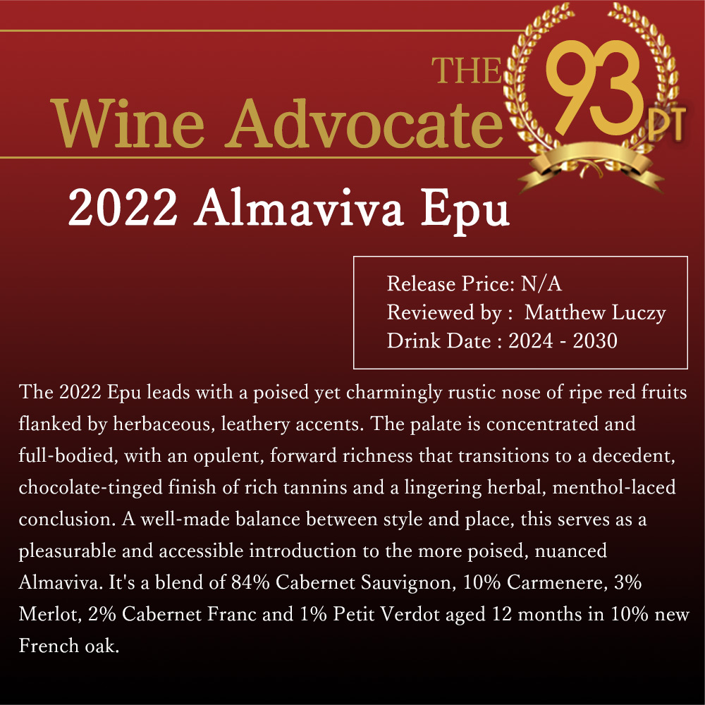 【商品名】エプ(アルマヴィーヴァ)[2022]年・バロン・フィリップ・ド・ロートシルト(ムートン・ロートシルト)&コンチャ・イ・トロ元詰(アルマヴィーヴァのセカンドワイン)・アルコール度数15.5%・ジェームス・サックリング過去指折りの驚異の95点&ワインアドヴォケイト93点&ワインスペクテーター92点【英名】Epu (Almaviva Puente Alto) 2022 Vina Almaviva EPU Concha Y Toro & Baron Philippe de Rothschild