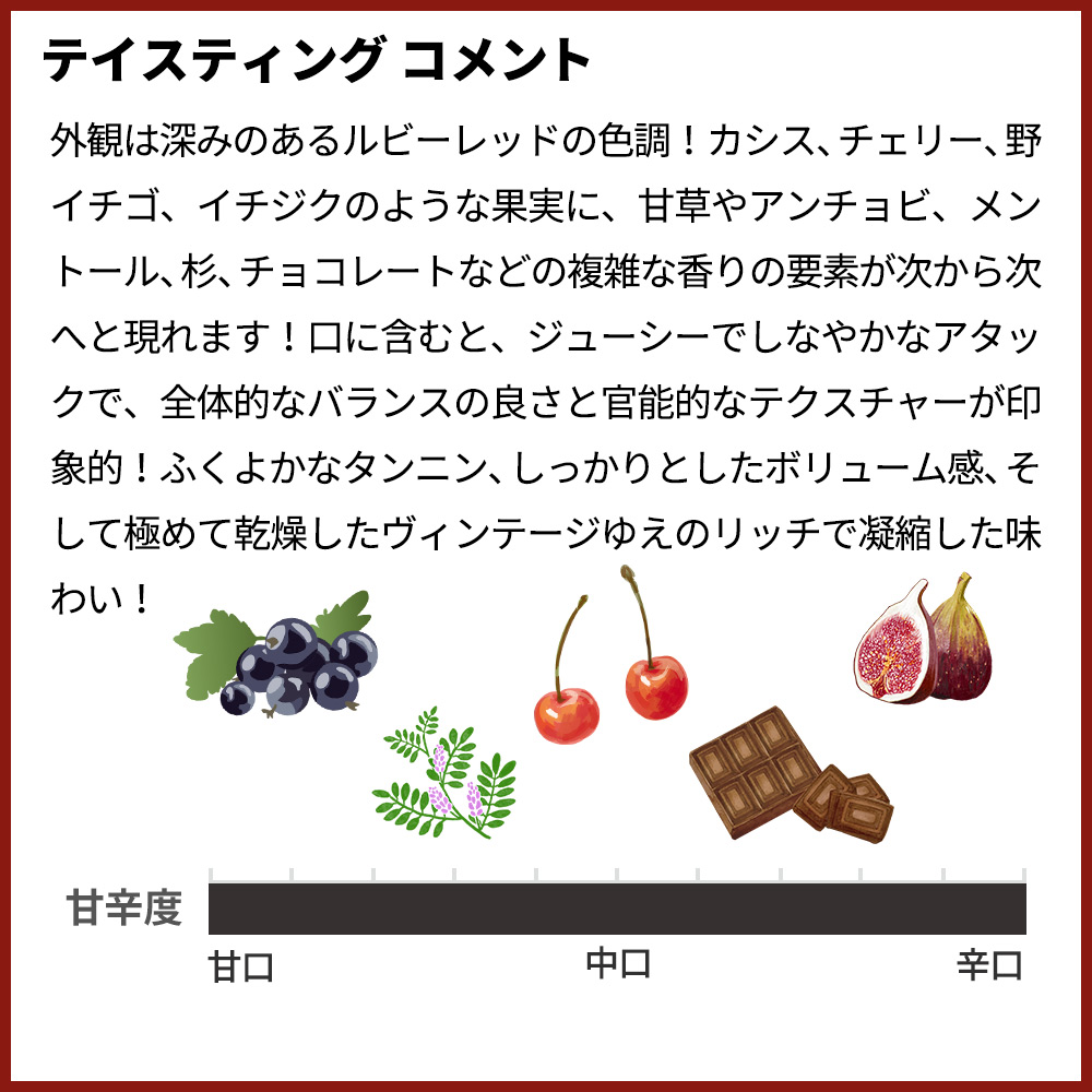 【ブドウの品種】カベルネ・ソーヴィニヨン84%、カルメネール10%、メルロ3%、カベルネ・フラン2%、プティ・ヴェルド1%