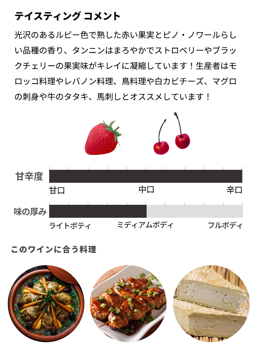 【商品説明】ルーマニア・ピノ・ノワール種100%辛口赤ワイン愛好家大注目!ブルゴーニュ・ピノ・ノワールファンも大注目!ルーマニアの中でも有名な葡萄産地、ムンテニア地方のデアル・マーレ地区からピノ・ノワール100%で造られる熟した赤い果実とピノ・ノワールらしい品種の香りに優れた癒し系辛口赤ワイン!造り手のドメーニレ・サハティーニは2003年に女性醸造家のアウレリア・ヴィシネスク氏によって創業されました!ワイナリーと畑はムンテニア地方のデアル・マーレ地域の中央にあるミジル(Mizil)村近郊にあり、畑は合計で82haを所有!ここはカルパティア山脈の南の斜面にあたり、コート・デュ・ローヌ地方と同緯度、ブルゴーニュ地方と同気候で、雨は少なく朝晩の温度差が激しいのが特徴!葡萄の品質の良さで知られています!当主のアウレリア氏の哲学はテロワールに強く影響を受けた葡萄を使いかつ、品種そのものの個性をしっかりと反映させることです!また環境に敬意を払い、最小限の人の介入で自然に近いブドウ栽培に努めています!このラ・ヴィ・ピノ・ノワール[2023]年・ドメーニレ・サハティーニはルーマニアの中でも有名な葡萄産地ラ・ヴィ・カルパティア山脈の南の斜面にあたる標高130mの5.11haの畑で収穫されるピノ・ノワール種100%で造られます!地質は様々なタイプのチェルノーゼム(黒土)と粘土石灰質土壌で、葡萄はギヨ仕立て!収量は42hl/haです!葡萄は収穫後、除梗破砕され1-2日間低温で静置された後にステンレスタンクで発酵を行います!マセラシオンは約10日、発酵の中盤に1日に2回ピジャージュを行います!熟成もオリと共にステンレスタンクで行います!仕上げられたこのワインは光沢のあるルビー色で熟した赤い果実とピノ・ノワールらしい品種の香り、タンニンはまろやかでストロベリーやブラックチェリーの果実味がキレイに凝縮しています!生産者はモロッコ料理やレバノン料理、鳥料理や白カビチーズ、マグロの刺身や牛のタタキ、馬刺しとオススメしています!もちろん現地のセラー数ヶ月前の蔵出し品で正規品で限定少量入荷!