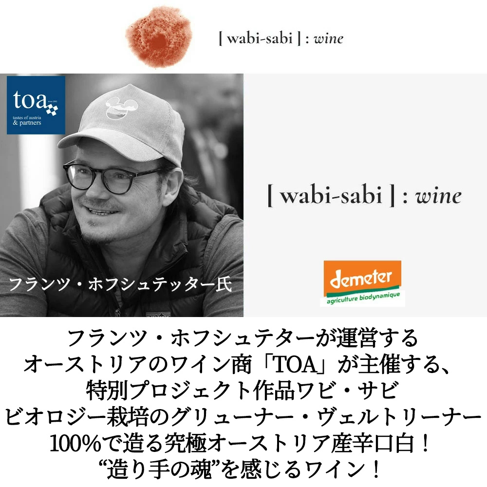 【商品説明】オーストリア辛口白ワイン愛好家大注目!グリューナー・ヴェルトリーナー種100%愛好家大注目!「ワビ・サビ」は、フランツ・ホフシュテターが運営するオーストリアのワイン商「TOA」が主催する、特別プロジェクト作品! ヴァッハウ出身のフランツは、オーストリアやニューヨークでソムリエとしての経験を積んだ後の2002年、オーストリア各ワイン産地のトップワイナリーと海外のマーケットを結び付けるプラットフォームを確立することを目的として、「TOA(Tastes of Austria)」を設立!今日では、オーストリアを代表するワイナリー約20社の輸出総代理店を務めると同時に、ブルゴーニュ型のクルティエ機能も担うハイブリッド型のワイン商として活躍し、その顧客には日本の錚々たるワインインポーターも名を連ねています!この「ワビ・サビ」は、「TOA」のパートナーワイナリー各社の協力のもと、2015年にスタートしたプロジェクトで、ビオロジー栽培のぶどうから造られたオーストリアの自然派ワインを、広く世界に紹介することを目的としています!統一されたコンセプトのもと、ワイナリー名や産地などは非公開となっています! 「ワビ・サビは、美が不完全なものによって定義される世界を表しています。不完全であるがゆえに、美しい。現代のワイン造りにおいて、ワインはしばしば、工学的に完全に設計された製品となっています。醸造家は、ワインの成分や製造工程を完全に管理し、完全なワインを造ることが求められます。しかし私たちは、完全なワインが飲み手を魅了するとは限らないと思います。「ワビ・サビ」プロジェクトでは、生きている、あるがままの姿こそがワインの「品質」であると考えます。個性は、完全なものよりもはるかに美しいと私は思います」。 ラベルのアートワークは、オーストリアの写真家ダヴィッド・クルツ氏!「この幾何学的模様は、印画紙への滴下といったダヴィッドのアナログ的な手業によって生まれたもので、再現できず、定義することもできません。この「不完全な」模様から、ワインの個性を、直感的に想像してください」。「パートナーの造り手たちの目標は、個性と深みのあるワインを造ることです。彼らは自然と対立せず、共生しています。無農薬で栽培されたぶどう畑は、植物、動物、そして人間に理想的な調和をもたらし、そのワインは人生に喜びを与えてくれます。「ワビ・サビ」のワインと対話する時、あなたは、そのワインにかけられた魔法 -造り手の魂- を感じることができるでしょう」とフランツ・ホフシュテター氏! 今日「ワビ・サビ」は、EU各国、アメリカ、カナダ、シンガポールで展開されており、特にニューヨークをはじめとしてアメリカでは、自然派オーストリアワインの大ベストセラーに!白亜(石灰)質・ローム・レス(黄土)土壌からの自然派ビオロジー栽培(2014年に「Codex Alimentarius Austriacus」の認証取得)の平均樹齢25年のグリューナー・ヴェルトリーナー種100%(手摘み100%)!除梗率50%!天然酵母のみで発酵!ステンレスタンクで醸造!SO2の使用は最小限!という超こだわりのもと造られた究極オーストリア産辛口白ワインが限定で、しかも蔵出しで極少量入荷!