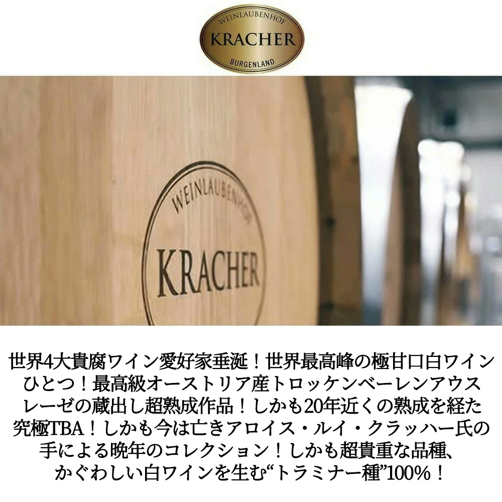 【商品説明】高級貴腐極甘口白ワイン愛好家垂涎!世界4大貴腐ワイン愛好家垂涎!世界最高峰の極甘口白ワインひとつ!最高級オーストリア産トロッケンベーレンアウスレーゼの蔵出し超熟成作品!しかも20年近くの熟成を経た究極TBA!しかも今は亡きアロイス・ルイ・クラッハー氏の手による晩年のコレクション!しかも超貴重な品種、かぐわしくトロピカルフルーツ、メロン、蜂蜜、アプリコットなど豊かな果実香が特徴の白ワインを生む“トラミナー種”100%! しかもオーストリアトップ生産者!ロバート・パーカー5つ星生産者で(彼のこのウェルシュリースリングのTBAの2000年はなんと!パーカーポイント99点(というほぼ満点)の評価を得て、トリプルAの地位を確立!)ヒュー・ジョンソン氏も満点4つ星つけ、「イルミッツの第一級の生産者!貴腐を成就したプレディカーツ!」と激賞!ニール・ベケット氏の「死ぬ前に飲むべき1001ワイン」にもこの「5Aのウェルシュリースリング」が登場!「アロイス・クラッハー氏は現在の語り草になっている」とこれまた大絶賛!しかもオーストリアトップ生産者!!この故アロイス・クラッハー氏の手による晩年のコレクション[2007]年の超貴重な品種、かぐわしい白ワインを生む“トラミナー種”100%!この故アロイス・クラッハー氏の手による晩年のコレクション! このシリーズの「Nouvelle Vague」はこのシリーズの中で樽熟成(バリック熟成)を取り入れたラインで、ワインに複雑さやスパイシーさ、深みを与えています。名前の「Nouvelle Vague」はフランス語で「新しい波」を意味し、伝統的な甘口ワインに対して新しいコンセプトの熟成スタイルを示すものです。オーストリアのKracherによる特別な貴腐ワインシリーズ名で、非常に甘くて濃厚なだけでなく、樽熟成による複雑で洗練された味わいが楽しめるワインとなっています。 このクラッハー・コレクションNo.2・トラミナー・トロッケンベーレンアウスレーゼ・ヌーヴェル・ヴァーグ[2007]年でワインスペクテイター誌驚異の91点&オーストリアのワインマガジン「フォルスタッフ」のピーター・モーザ氏がファルスタッフ誌で驚異の94点獲得!大絶賛コメントは『濃いイエローゴールド。ローズオイル、マシュマロ、ミネラルスパイス、熟したバナナ、新鮮なハチミツの強いニュアンスに、ほのかにモミの香りが感じられる、力強く魅力的なブーケ。エレガントでジューシーなハチミツの香り、シナモンの微細なニュアンス、ドライフルーツの微妙な香り、ミネラル感の残る余韻、木の香りは完全に溶け込み、フィニッシュは非常に軽やかで精緻。94点』と大絶賛! アロイス・クラッハー氏の手による晩年のコレクションで当店オーナーも2005年に訪問し、このクラッハーに惚れ込んでしまいました!貴腐ワインファン納得!の逸品です!究極フルボディ貴腐コレクション極甘口白ワインの19年熟成作品が正規品の素晴らしい状態で限定少量入荷!