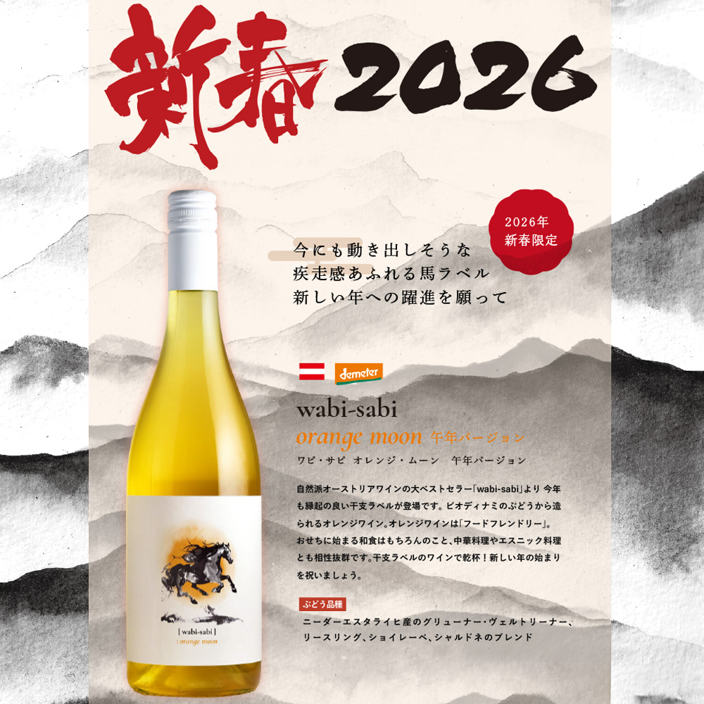 【商品説明】オーストリア産大人気オレンジワイン愛好家大注目!その名も≪オレンジ・ムーン≫!オーストリア自然派ビオロジック栽培のグリューナー・ヴェルトリーナー90%、リースリング10%で造られる大人気オレンジワイン!その名も≪オレンジ・ムーン≫!≪ワビ・サビ・オレンジ・ムーン・駆け上がる馬(午)ラベル≫!しかも『天に駆け上る馬(午)と2026年の干支である【午】(うま) をかけ合わせた幸運を呼ぶ午(馬)としてラベルデザイン』された「TOA」による人気の≪ワビ・サビ・オレンジ・ムーン・駆け上がる馬(午)ラベル≫! 「ワビ・サビ」は、フランツ・ホフシュテターが運営するオーストリアのワイン商「TOA」が主催する、特別プロジェクト作品!ヴァッハウ出身のフランツは、オーストリアやニューヨークでソムリエとしての経験を積んだ後の2002年、オーストリア各ワイン産地のトップワイナリーと海外のマーケットを結び付けるプラットフォームを確立することを目的として、「TOA(Tastes of Austria)」を設立!今日では、オーストリアを代表するワイナリー約20社の輸出総代理店を務めると同時に、ブルゴーニュ型のクルティエ機能も担うハイブリッド型のワイン商として活躍し、その顧客には日本の錚々たるワインインポーターも名を連ねています! この「ワビ・サビ」は、「TOA」のパートナーワイナリー各社の協力のもと、2015年にスタートしたプロジェクトで、ビオロジー栽培のぶどうから造られたオーストリアの自然派ワインを、広く世界に紹介することを目的としています!統一されたコンセプトのもと、ワイナリー名や産地などは非公開となっています!「ワビ・サビは、美が不完全なものによって定義される世界を表しています。不完全であるがゆえに、美しい。現代のワイン造りにおいて、ワインはしばしば、工学的に完全に設計された製品となっています。醸造家は、ワインの成分や製造工程を完全に管理し、完全なワインを造ることが求められます。しかし私たちは、完全なワインが飲み手を魅了するとは限らないと思います。「ワビ・サビ」プロジェクトでは、生きている、あるがままの姿こそがワインの「品質」であると考えます。個性は、完全なものよりもはるかに美しいと私は思います」。 ラベルのアートワークは、オーストリアの写真家ダヴィッド・クルツ氏!「この幾何学的模様は、印画紙への滴下といったダヴィッドのアナログ的な手業によって生まれたもので、再現できず、定義することもできません。この「不完全な」模様から、ワインの個性を、直感的に想像してください」。「パートナーの造り手たちの目標は、個性と深みのあるワインを造ることです。彼らは自然と対立せず、共生しています。無農薬で栽培されたぶどう畑は、植物、動物、そして人間に理想的な調和をもたらし、そのワインは人生に喜びを与えてくれます。「ワビ・サビ」のワインと対話する時、あなたは、そのワインにかけられた魔法 -造り手の魂- を感じることができるでしょう」とフランツ・ホフシュテター氏!今日「ワビ・サビ」は、EU各国、アメリカ、カナダ、シンガポールで展開されており、特にニューヨークをはじめとしてアメリカでは、自然派オーストリアワインの大ベストセラーに! ついに2019年に日本に登場したwabi-sabi (ワビ・サビ) によるヴァインフィアテル産のローム層基盤の砂利質土壌からの平均樹齢45年の自然派ビオロジック栽培のグリューナー・ヴェルトリーナー90%、リースリング10%!除梗率80%!天然酵母のみで発酵!ステンレスタンクでスキン・コンタクトを行ったオレンジワイン!グリューナー・ヴェルトリーナーは18ヶ月間、リースリングは7ヶ月間熟成させた後にブレンド!ビン詰め時にのみ極少量のSO2を使用!超こだわりオレンジワイン! しかも『天に駆け上る馬(午)と2026年の干支である【午】(うま)をかけ合わせた幸運を呼ぶ午(馬)としてラベルデザイン』された「TOA」による人気のワビ・サビ・オレンジ・ムーン・駆け上がる馬(午)ラベル!が現地のセラー数ヶ月前の現地セラー出しで限定少量入荷!