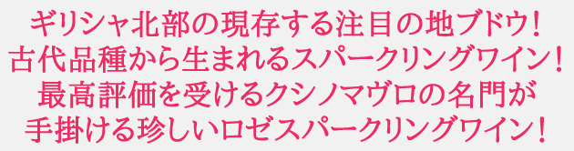 ![]() アカキーズ スパークリング ロゼ 2021 キリヤーニ ムースのような泡は優しく包み込むような口当たりです。イキイキとしたストロベリーやチェリーなどの果実味は典型的なクシノマヴロのアロマ。突出した高い酸がアクセントになり、上品で柔らかな味わいが素晴らしいバランスを生みます。品種:クシノマヴロ種100%産地: P.D.Oアミンデオン土壌:砂質ローム醗酵:ステンレスタンク(シャルマ方式)、マロラクティック醗酵なし熟成:テンレスタンクで2ヶ月ガス圧:5.1残糖度:18g/L ![]() |