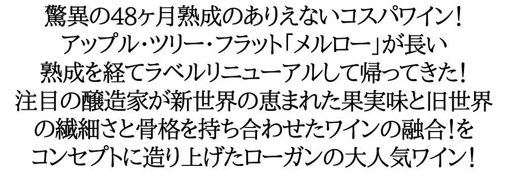 【商品説明】オーストラリア愛好家大注目!メルロー愛好家大注目!驚異の48ヶ月熟成のありえないコスパワイン!アップル・ツリー・フラット「メルロー」が長い熟成を経てラベルリニューアルして帰ってきました!涼しくも日照量に恵まれた高地(564-870m)で栽培される密度がありジューシーでエレガントなローガン自慢のコスパ・メルロー!注目の醸造家が新世界の恵まれた果実味と、旧世界の繊細さと骨格を持ち合わせたワインの融合!をコンセプトに造り上げたローガン・ワインズ!のアップル・ツリー・フラット・シリーズ!オーストラリアを代表するクールメイトの造り手!醸造家ピーター・ローガンによって1997年に設立!ピーター氏が目指すワインは、オーストラリア・ワインの良さであるパワーと恵まれたフルーティな果実味、それに旧世界の繊細さ、骨格、バランスを融合させた独自のワイン!理想とするワイン造りに選んだのはオーストラリアで最も冷涼な気候を持つ産地のひとつである「オレンジ」地区、「マジー」地区(標高500-1100m)でブドウを栽培!リッチで繊細な果実味と引き締まった酸とエレガントな質感を持つワインは、多くの金賞をはじめ、高い評価を獲得!このアップル・ツリー・フラット・メルローは、セントラル・レンジスG.I.(オレンジ58%、マジー42%)の厳選メルロー100%を天然酵母でステンレスタンク醗酵!その後、オーク樽熟成18ヶ月(旧樽/225L、300L、500L)さらにステンレスタンク熟成29ヶ月の合計で驚異の48ヶ月熟成でリリースされるこだわり品!ブルベリーやダークチョコレート、タバコ、スミレ、タイム、ローズマリーのアロマ!ブラックベリーやプラム、ほのかな胡椒の要素がかすかに表れる!タンニンの溶け込んだスムーズな口当たりと酸味の乗った丸みを帯びた果実味!ハイ・コスパ極旨オーストラリアン・メルローが遂に登場!