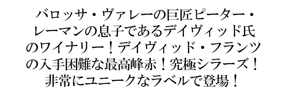 ![]() バロッサ・ヴァレーの巨匠ピーター・レーマンの息子であるデイヴィッド氏のワイナリー、デイヴィッド・フランツ。 「ワインはどこで造られるのか、ということをまず理解しなければならない。」が持論の父の指導により、畑で働き始めたデイヴィッドは、その経験と素晴らしい指導者のおかげでぶどうの樹に対する知識と情熱が膨らみ、現在家族で所有する75エーカーの畑を管理。畑での自由な裁量を持ち、収獲高のために妥協せず、最高品質のぶどう造りに専念。 ![]() 畑での自由な裁量を持ち、収穫高のために妥協せず最高品質のぶどう造りに専念。「最初に畑で一年間育ち、ワイナリーで数か月かけて職人の手によって造られ、樽とボトルの中で熟成されてワインができるという事を知って、飲む人は自分のワインを味わう事が出来る」と語るほど、ぶどう栽培とワイン造りに心を奪われたデイヴィッド・フランツ氏。 このアレクサンダーズ・リワード・カベルネ・ソーヴィニヨン・シラーズは、砂とローム層と粘土質土壌のストーンウエルヒルとステルザーロードの小ロットの区画からのカベルネ・ソーヴィニヨン75%、シラーズ25%をアメリカンオークとフレンチオークの新樽と古樽で30ヶ月間熟成!澱と共に熟成した後、ブレンドしてボトリングしている。 |