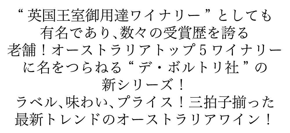 ![]() 1924年ヴィットリオ・デ・ボルトリは、全財産をもって新天地オーストラリアに、北イタリアから移民としてやって来ました。1928年、弟ピエリノと共に55エーカーのブドウ畑をニューサウスウェールズ州ビルブルに購入しワイナリーを設立しました。 ![]() 1979年設立者であるヴィットリオの死後、2代目ディーン・デ・ボルトリが相続し、ビジネスの拡張と安定が図られました。そして1982年に3代目のダーレンがセミヨン種で造った貴腐ワイン、ノーブルワンが成功し世界的に注目され、以後現在まで数多くのトロフィーや金メダルを受賞し、デ・ボルトリ社はテーブルワインのみならず、プレミアムワインメーカーとしての確固たる地位を築き上げたのです。 ![]() 現在では年間6000000ケースを超える生産量を誇り、オーストラリア最大級のワイナリーとなっています。最近ボルトリファミリーの娘婿であるワインメーカーのスティーブは、ワインメーカーオブザイヤーも受賞しています。彼らは“高い価値のある地域の特性をしっかり持ったワイン造り”をモットーとしワインは品種の特性だけではなく、地域と季節の特徴を持つべきと信じており“産地の個性”を大切にしています。 |