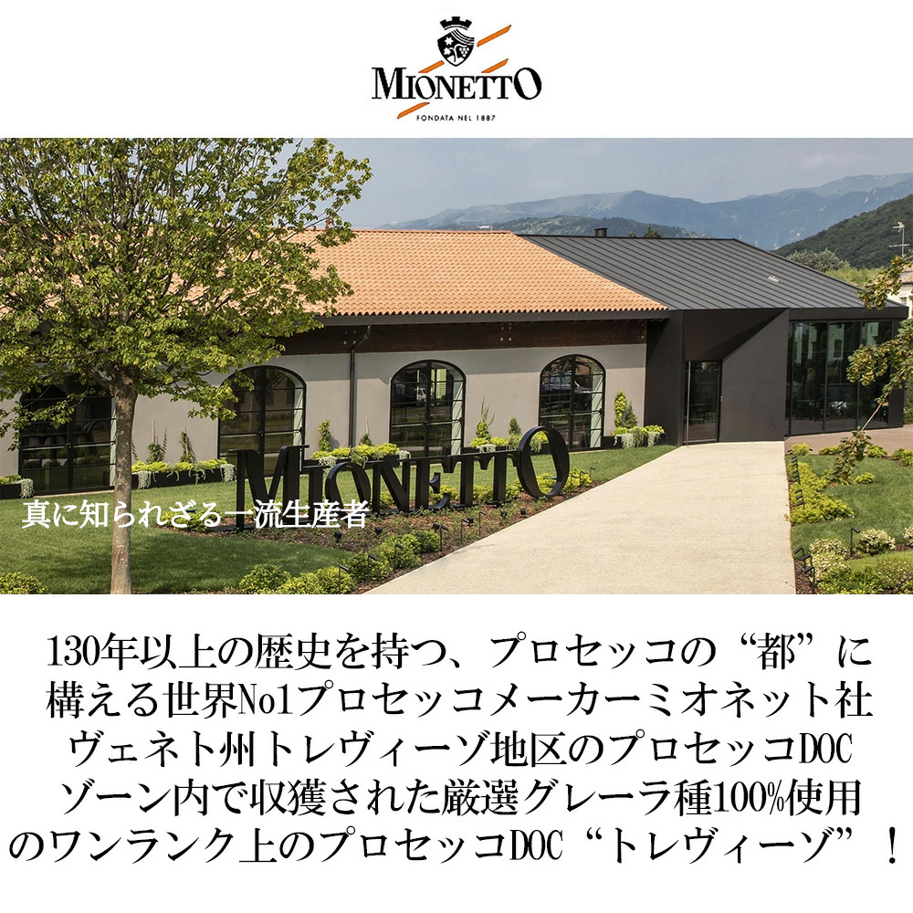 【商品説明】イタリア辛口スプマンテ愛好家大注目!イタリア辛口スパークリング愛好家大注目! しかもグレーラ種(プロセッコ種)100%!しかもヴェネト州トレヴィーゾ地区のプロセッコDOCゾーン内で収獲されたグレーラ種100%使用! 造り手は、130年以上の歴史を持つプロセッコの“都”に構える世界No.1プロセッコメーカー(IWSR 2018 International brandにおいて)であるミオネット社!1887年フランチェスコ・ミオネットによりプロセッコの“都”ヴァルドッビアーデネで創業!2008年からはヘンケルグループに入り、世界約70カ国に販売するグローバルプロセッコメーカーの一つに!2009年にプロセッコがDOC認証され、ぶどう栽培地域が拡大されたが、ミオネットは以前よりプロセッコが、生産されていたトレヴィーゾ県ヴァルドッビアーデネでワイン造りを続けているミオネット社のフラッグシップ!こだわり究極プロセッコ!通常DOCよりワンランク上のプロセッコDOC“トレヴィーゾ”! 軽やかな白い花、フレッシュなリンゴ、やさしい果実味とふんわりとした泡立ち!やわらかな味わいの後のホロ苦さが程よく引き締める!素直でプロセッコらしい味わいのミオネット・プロセッコ・ブリュットが専用カートン(箱入)で限定で少量入荷!