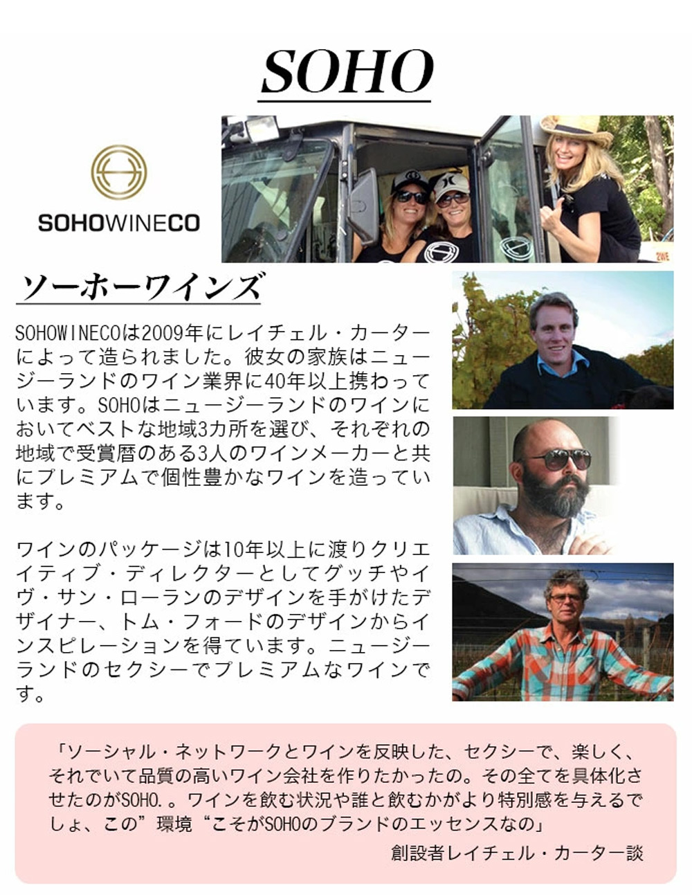 ![]() SOHOWINECOは2009年にレイチェル・カーターによって造られました。彼女の家族はニュージーランドのワイン業界に40年以上携わっています。SOHOはニュージーランドのワインにおいてベストな地域3カ所を選び、それぞれの地域で受賞暦のある3人のワインメーカーと共にプレミアムで個性豊かなワインを造っています。 ![]() ワインのパッケージは10年以上に渡りクリエイティブ・ディレクターとしてグッチやイヴ・サン・ローランのデザインを手がけたデザイナー、トム・フォードのデザインからインスピレーションを得ています。ニュージーランドのセクシーでプレミアムなワインです。 ![]() “ソーシャル・ネットワークとワインを反映した、セクシーで、楽しく、それでいて品質の高いワイン会社を作りたかったの。その全てを具体化させたのがSOHO.。ワインを飲む状況や誰と飲むかがより特別感を与えるでしょ、この”環境“こそがSOHOのブランドのエッセンスなの。” 創設者:レイチェル・カーター |