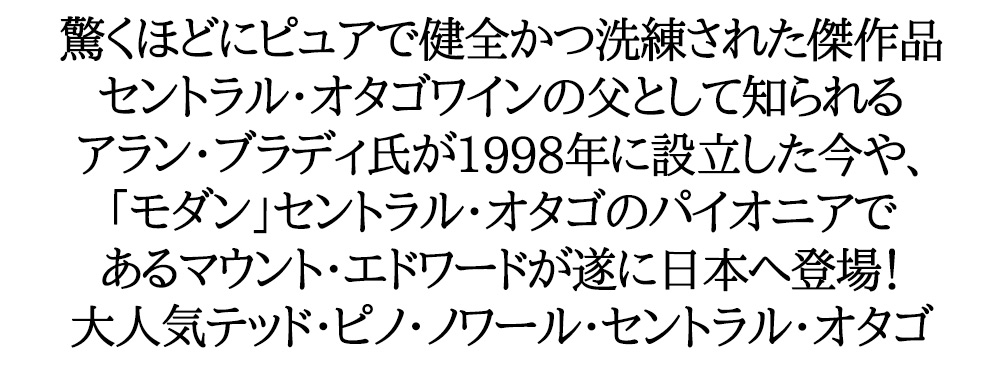 驚くほどにピュアで健全かつ洗練されたセントラル・オタゴワイン!「モダン」セントラル・オタゴのパイオニアであるマウント・エドワードが遂に登場!造り手のマウント・エドワードは、ニュージーランド最南端のワイン産地セントラル・オタゴにおけるワイン造りのパイオニア的存在!