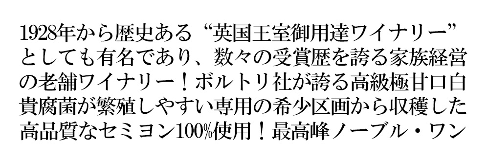 ![]() 1924年ヴィットリオ・デ・ボルトリは、全財産をもって新天地オーストラリアに、北イタリアから移民としてやって来ました。1928年、弟ピエリノと共に55エーカーのブドウ畑をニューサウスウェールズ州ビルブルに購入しワイナリーを設立しました。 1979年設立者であるヴィットリオの死後、2代目ディーン・デ・ボルトリが相続し、ビジネスの拡張と安定が図られました。そして1982年に3代目のダーレンがセミヨン種で造った貴腐ワイン、ノーブルワンが成功し世界的に注目され、以後現在まで数多くのトロフィーや金メダルを受賞し、デ・ボルトリ社はテーブルワインのみならず、プレミアムワインメーカーとしての確固たる地位を築き上げたのです。 ![]() 現在では年間6,000,000ケースを超える生産量を誇り、内側から高い評価を得ているオーストラリア最大級のワイナリーです。最近ボルトリファミリーの娘婿であるワインメーカーのスティーブは、ワインメーカーオブザイヤーも受賞しています。彼らは“高い価値のある地域の特性をしっかり持ったワイン造り”をモットーとしワインは品種の特性だけではなく、地域と季節の特徴を持つべきと信じており“産地の個性”を大切にしています。 |