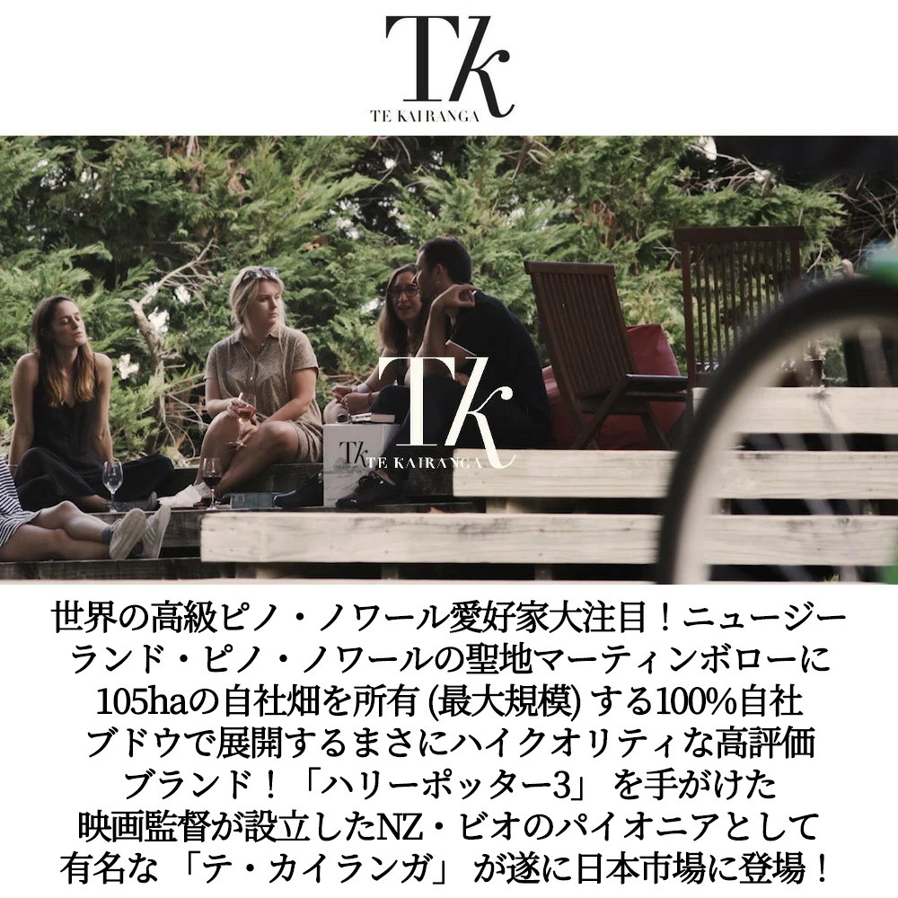 【商品説明】ブルゴーニュ・ピノ・ノワールファンも大注目!ニュージーランド・ピノノワール辛口赤ワイン愛好家大注目! ニュージーランド・ピノ・ノワールの聖地!ニュージーランドの北島にある小さな地区、ワイララパのサブリージョンであるマーティンボローに105haの自社畑を所有(最大規模)する100%自社ブドウで展開するハイクオリティな高評価ブランド!あの「ハリーポッター3」を手がけた映画監督が設立したニュージーランド・ビオのパイオニア!「テ・カイランガ」が遂に日本市場に登場! テ・カイランガの強みは105ヘクタールにも及ぶ自社畑(テ・カイランガが所有するブドウ畑は、マーティンボロー地区の中でも特に“グラン・クリュ地区”とまで称される、水はけの非常に良い、礫の混じる浅い粘土ローム質土壌が広がる“マーティンボロー・テラス”を中心に、標高や土壌、斜度、畑の向き等が異なる合計4地区で4つの農園を展開し、ピノ・ノワールを主軸に、シャルドネ、ソーヴィニヨン・ブラン、ピノ・グリそしてリースリングを栽培)! 広大な自社畑は醸造家に多くのチョイスを与え、マーティンボロー地区であってもコストパフォーマンスの高いワインを生み出すカギとなっている!それぞれの畑は異なるテロワールを有することから、品種に合わせ更に区画を分け栽培!それぞれ個別に収穫し、ワインを醸造・熟成!「ピノ・ノワール」においては、その原酒の数は60種を超えるとか! 全てのワインはコンセプトに合わせ原酒を厳選しブレンド!マスター・オブ・ワインでもある元ヴィッラ・マリアの主任醸造アラステア・メイリング氏が統括醸造家として参加し、チーフ醸造家のジョン・カヴァナ氏と共にテロワールの魅力を引き出します!丁 寧な栽培・醸造と匠の技術がコスパに優れた高評価ワインを生み出す「テ・カイランガ」による看板ピノ・ノワール!「TK ピノ・ノワール」!自然派サステーナブル農法の厳選ピノ・ノワール100%を7日間のコールドソーク後ステンレス・タンク醗酵(一部全房醗酵)!フレンチオーク樽10カ月(225L、新樽比率17%)、一部ステンレス・タンク熟成で造られる傑作ピノ・ノワール! キイチゴやプラムの甘酸っぱい香と仄かに若木やキノコのアロマ!シルキーなタンニンで鮮やかなベリー系の果実が溶け込み、シダ類や塩味が余韻に現れる、傑作マーティンボローピノが限定で少量入荷!