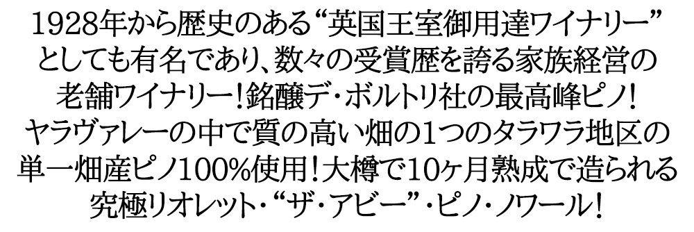 デ・ボルトリ“リオレット”ザ・アビー・ピノ・ノワール[2018]年 産地: ヴィクトリア州、 ヤラヴァレー、(タラワラ地区)単一畑 北東向きの緩やかな斜面 (植樹)1993年 (クローン) MV6 ブドウ品種 :ピノ・ノワール 100%  樽熟成 : 10ヶ月(大樽 / 新樽と古樽) リオレット シリーズは、ヤラヴァレーとモーニントンペニンシュラにある、シングルヴィンヤードのブドウから造られたピノ・ノワールとシャルドネコレクションで、ブドウの生育が最高に良いヴィンテージのみ造られます。畑では、土中の菌類やバクテリアの活動の改良、葉やその周辺の野生の捕食者への働きかけに対して、適切な配慮を行いながら、可能な限りビオディナミ農法が用いられています。全ての区画がデ・ボルトリ家の所有ではありませんが、栽培の細部に至るまで管理し、畑へのより持続可能な取り組みを行っています。 アビーヴィンヤードはヤラヴァレーの中で質の高い畑のひとつのタラワラ地区のブドウを使用しで、真の実力を持ったピノ・ノワールが造られています。土壌はミネラルを多く含むシルト岩で、洗練されたワインスタイルとなります。2018年は適度に雨があるとても良い年で葡萄の状態は良い自然の酸と鮮やかな色合いを持つほぼ完ぺきの状態のブドウが収穫出来ました。 手摘みで収穫し選別されたブドウは発酵槽に運ばれ、18日間の発酵期間中に4回のプランジングと4回のルモンタージュを実施。その後、澱と共に10ヶ月間大樽(新樽と古樽)で熟成させています。 明るいミディアムレッド。 ブルーベリー、ラズベリー、ジビエ、ウッドスモークなどの香りがあり、非常に純粋。きめの細かいテクスチャー、スパイス、ほのかな塩分が含まれ、穏やかな味わいで満たされます。