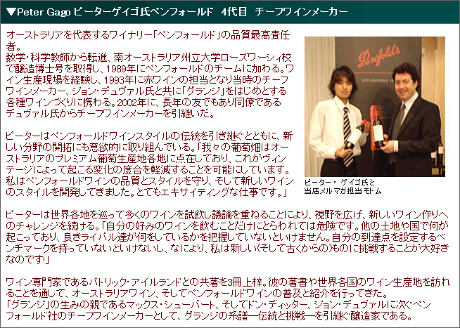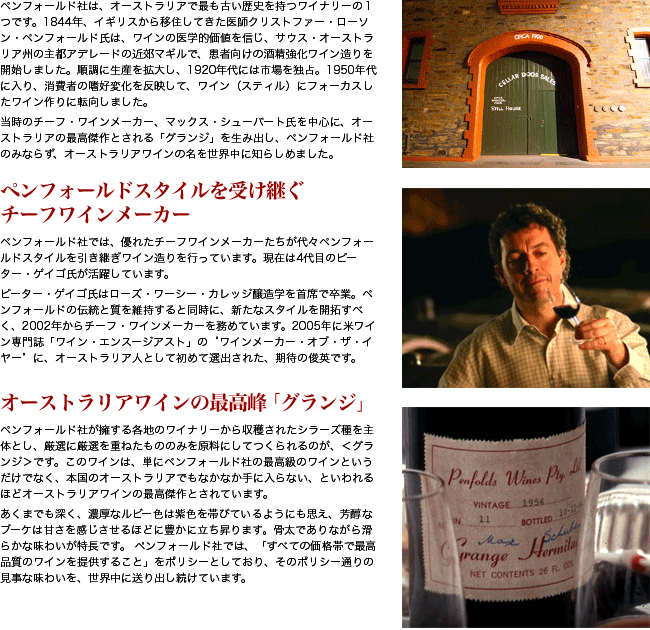 ![]() ペンフォールド社は、オーストラリアで最も古い歴史を持つワイナリーの1つです。1844年、イギリスから移住してきた医師クリストファー・ローソン・ペンフォールド氏は、ワインの医学的価値を信じ、サウス・オーストラリア州の主都アデレードの近郊マギルで、患者向けの酒精強化ワイン造りを開始しました。順調に生産を拡大し、1920年代には市場を独占。1950年代に入り、消費者の嗜好変化を反映して、ワイン(スティル)にフォーカスしたワイン作りに転向しました。当時のチーフ・ワインメーカー、マックス・シューバート氏を中心に、オーストラリアの最高傑作とされる「グランジ」を生み出し、ペンフォールド社のみならず、オーストラリアワインの名を世界中に知らしめました。 ![]() ペンフォールド社では、優れたチーフワインメーカーたちが代々ペンフォールドスタイルを引き継ぎワイン造りを行っています。現在は4代目のピーター・ゲイゴ氏が活躍しています。ピーター・ゲイゴ氏はローズ・ワーシー・カレッジ醸造学を首席で卒業。ペンフォールドの伝統と質を維持すると同時に、新たなスタイルを開拓すべく、2006年からチーフ・ワインメーカーを務めています。2005年に米ワイン専門誌「ワイン・エンスージアスト」の“ワインメーカー・オブ・ザ・イヤー”に、オーストラリア人として初めて選出された、期待の俊英です。 ![]() グランジはペンフォールドのみならずオーストラリアのフラッグシップワインとして象徴的な存在となっています。1951年(実験的な瓶詰)以来とぎれるころなく「サウスオーストラリアの土壌と天候とシラーズ」の相乗効果を体現してきたことを誇ります。本国のオーストラリアでもなかなか手に入らないと言われるほどオーストラリアワインの最高傑作とされています。完熟し凝縮した質感を持つシラーズとアメリカンオークの新樽との組み合わせから生まれた、無二のオーストラリアンスタイル"世界で最も一貫したワインスタイルのひとつ"として認識されています。グランジスタイルとは、ペンフォールドの「マルチヴィンヤード(複数畑)、マルチディストリクト(複数栽培地域)ブレンディング」の理念をもっとも力強く表現している、オリジナリティあふれるワインです。 |